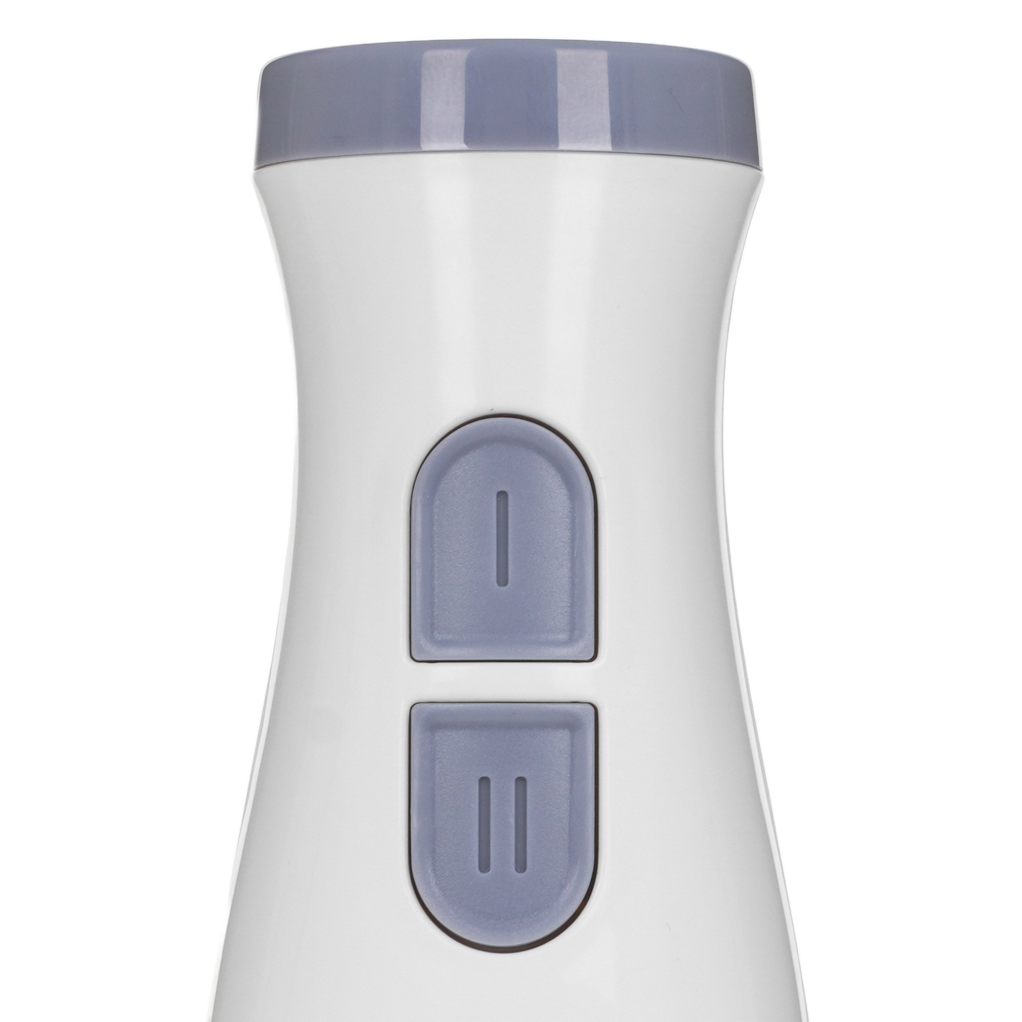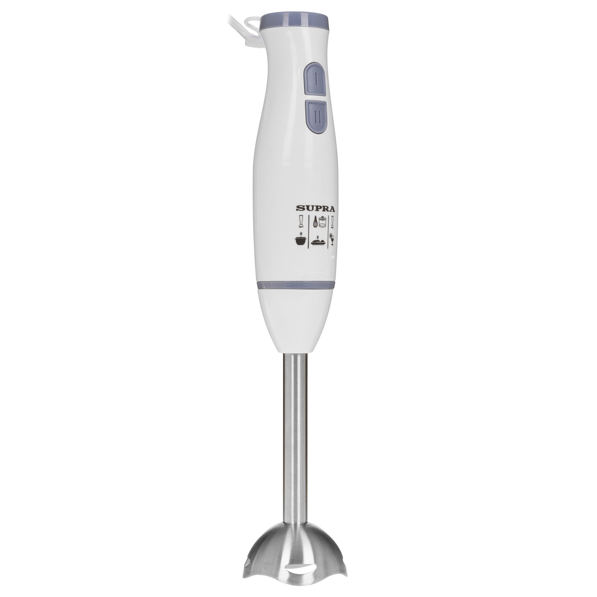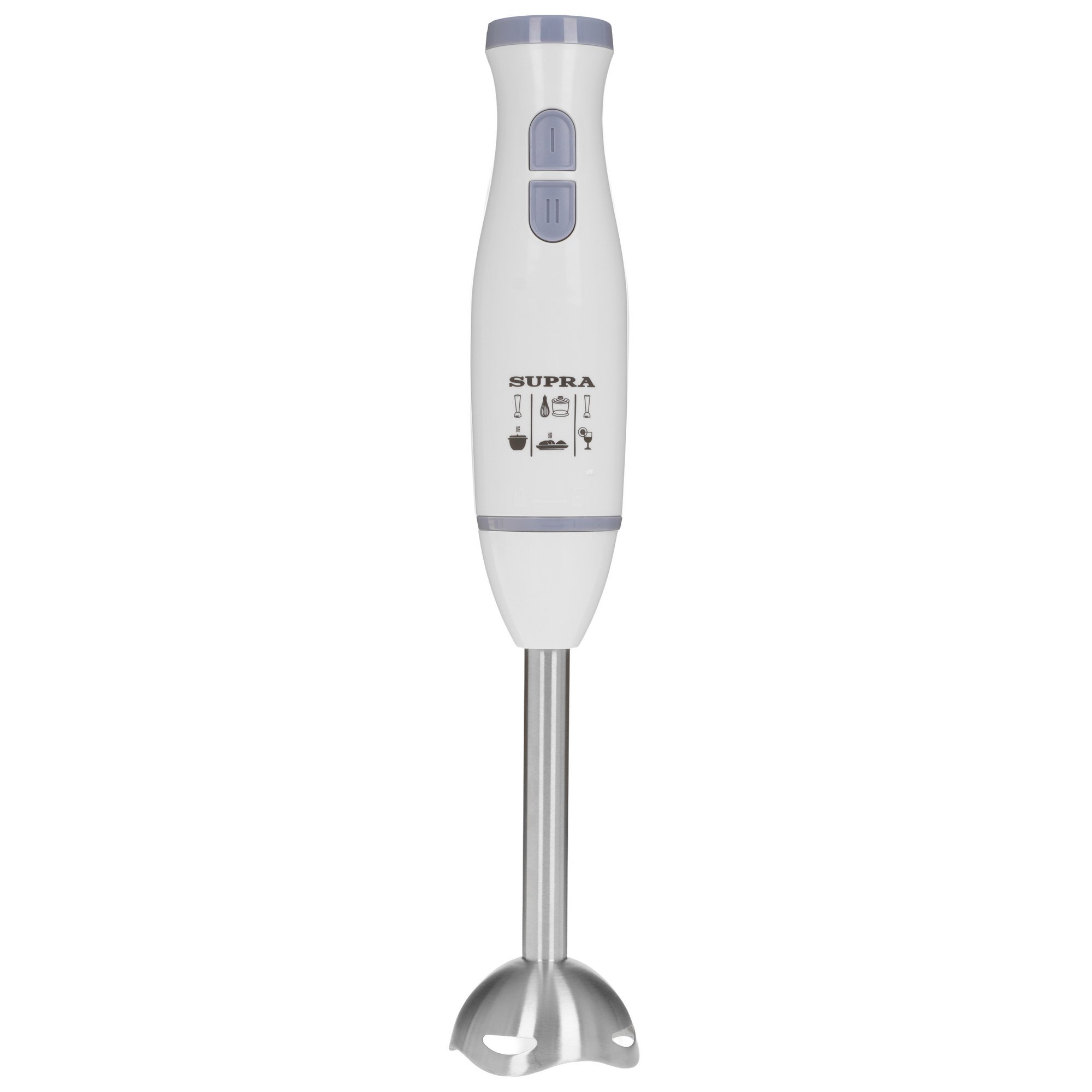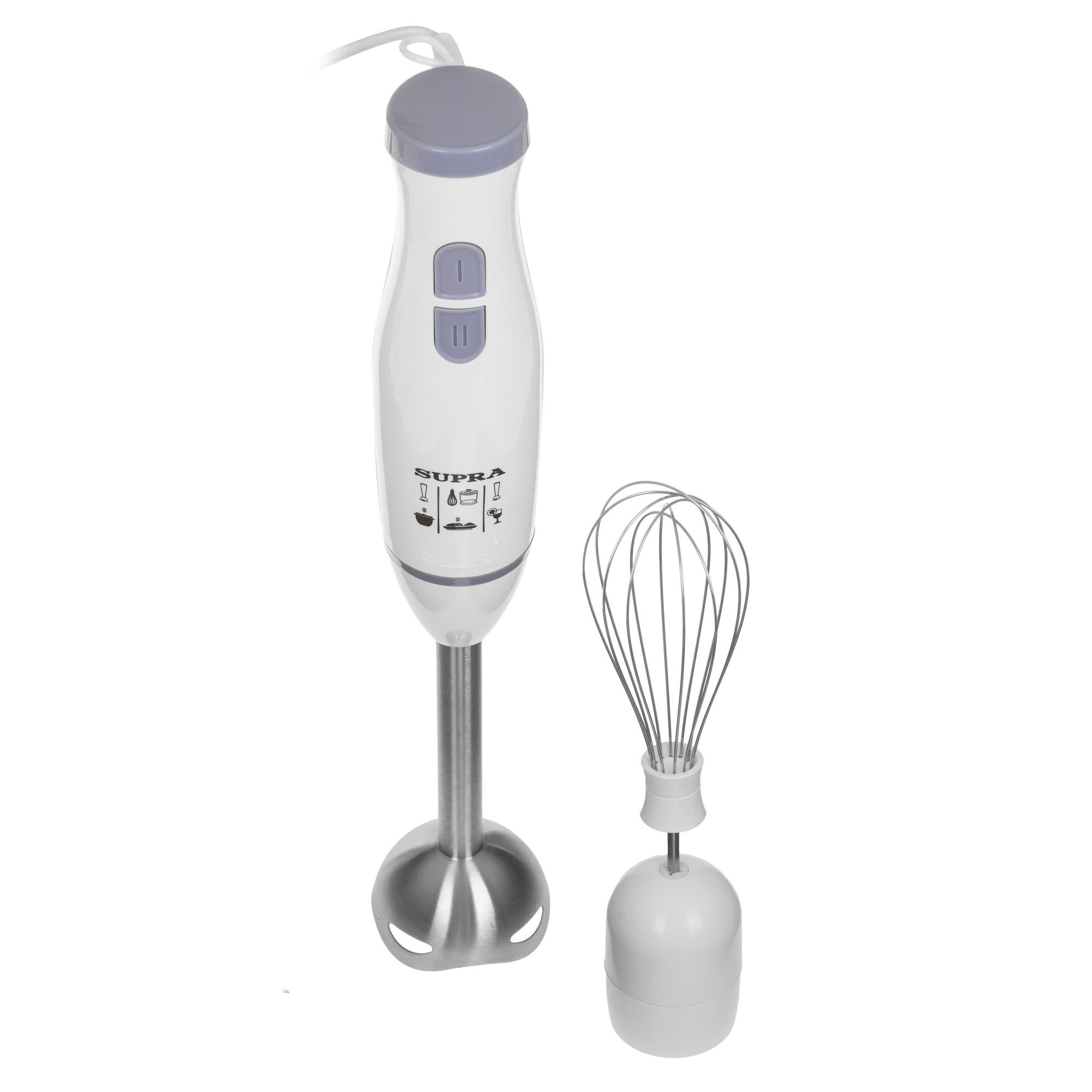 Погружной блендер SUPRA HBS-695 в белом цвете корпуса имеет в комплектации 2 насадки – измельчитель и венчик. Первая пригодится, если вы хотите порубить продукты на одинаковые мелкие кусочки или довести смесь до однородности, а вторая, насадка-венчик, поможет замесить тесто, взбить яичный белок или сделать милкшейк. S-образный нож, который перерабатывает продукты, сделан из нержавеющей стали, поэтому отличается прочностью и долго не затупляется.