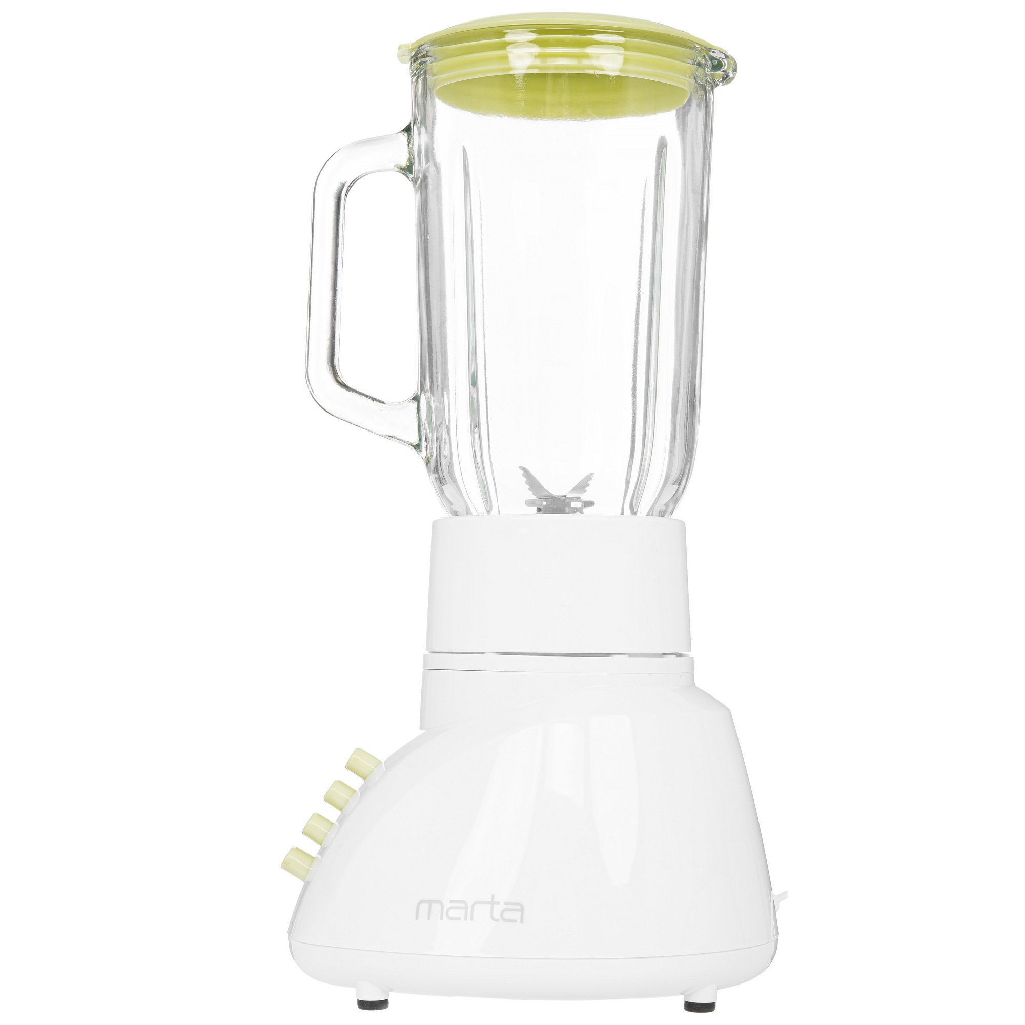Блендер стационарный Marta MT-1568 белого цвета с бирюзовыми вставками предназначен для взбивания, измельчения и смешивания разных продуктов до однородной консистенции. Мощности 800 Вт достаточно, чтобы измельчать твердые ингредиенты: орехи, кофейные зерна. Ножи из нержавеющей стали долгое время остаются острыми, что обеспечивает хорошую производительность прибора. В чашу из толстого стекла помещается до 1.2 л продуктов. Мерная шкала позволяет точно определить количество ингредиентов и получившегося продукта.