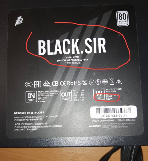 Блок питания 1STPLAYER SR-500W, 500Вт, 80 PLUS, 120мм, черный