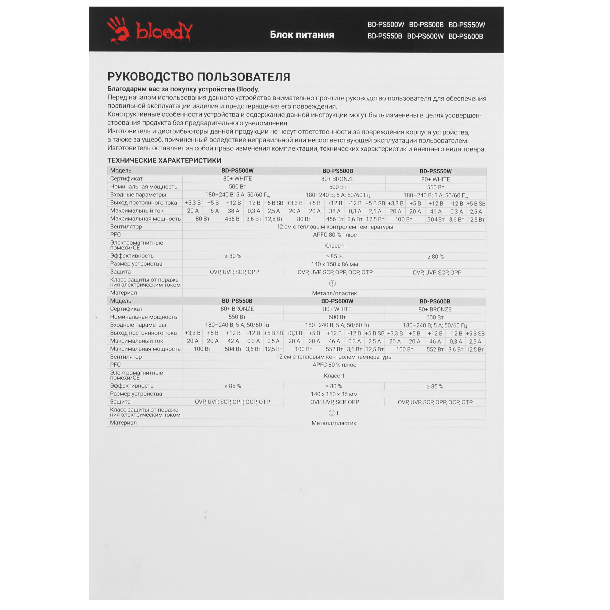 Блок питания A4Tech Bloody BD-PS550B представляет собой эффективное решение для компьютерных систем среднего уровня. Этот блок питания имеет мощность 550 Вт и сертификацию 80 PLUS Bronze, что обеспечивает хорошую энергоэффективность. Он оснащен активным корректором коэффициента мощности (APFC) и соответствует стандарту ATX 12V v2.31. Основной разъем питания 20+4 pin гарантирует совместимость с широким спектром материнских плат.