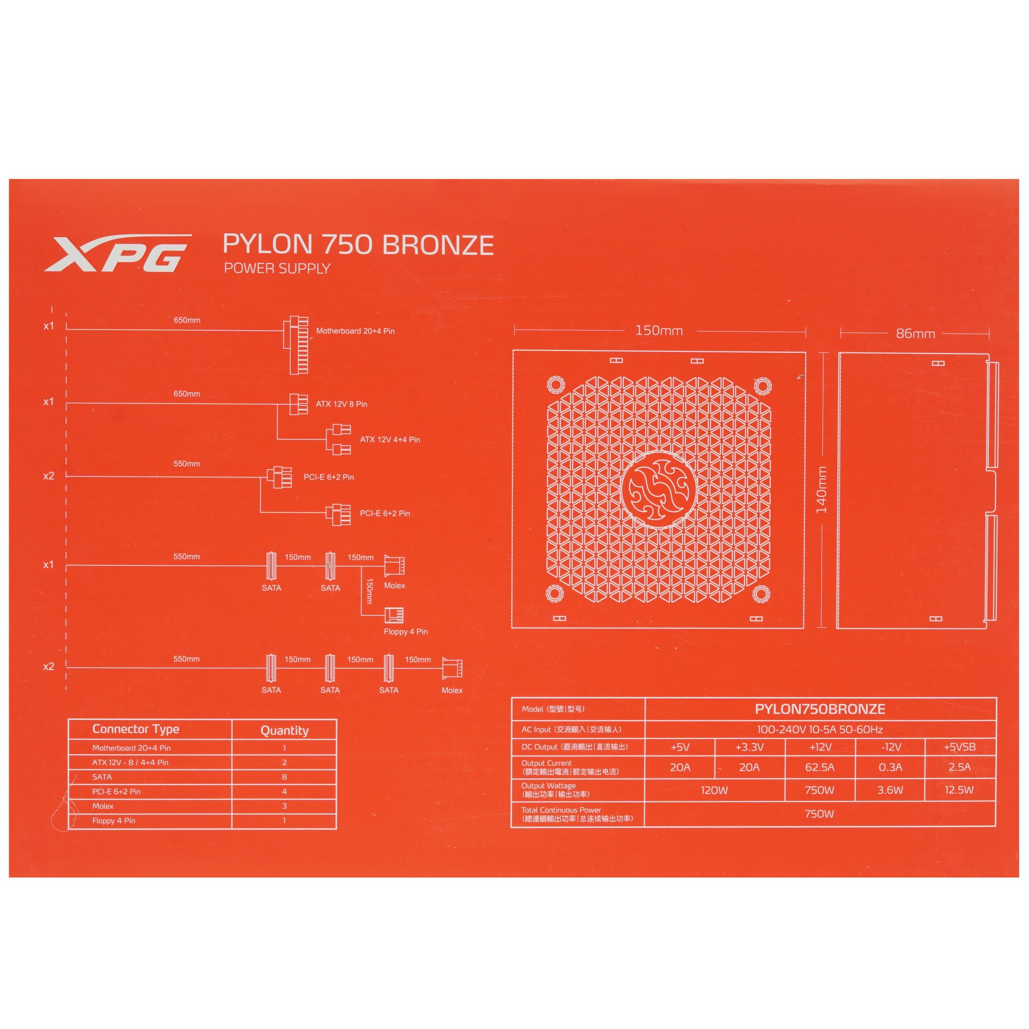 Блок питания ADATA XPG PYLON 750 (PYLON750B-BKCEU), 750 Вт, 120мм, 80 PLUS Bronze, 120мм, черный