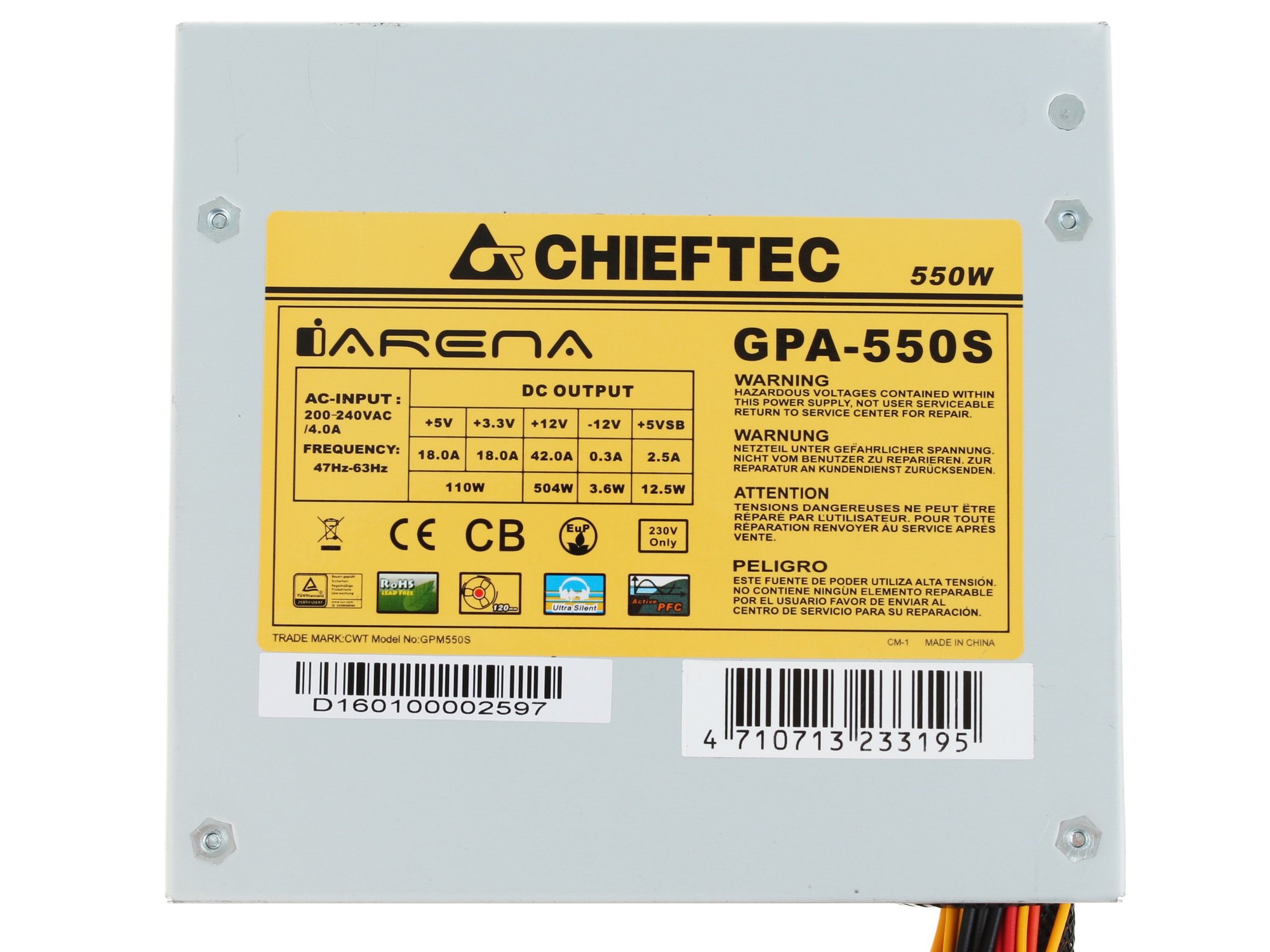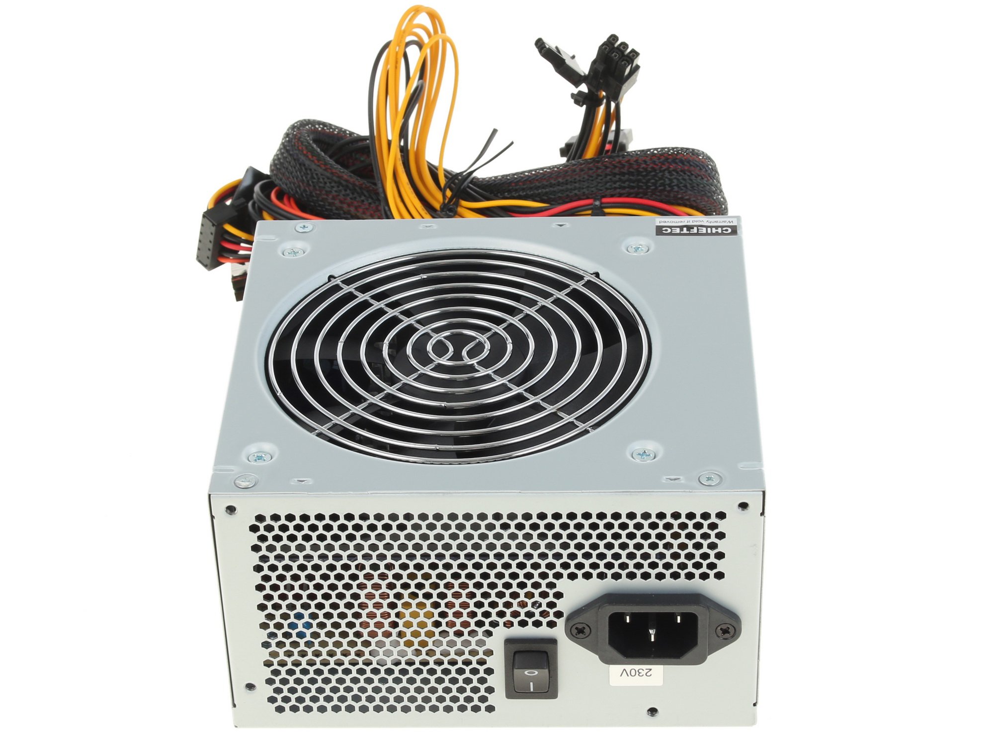 Блок питания Chieftec iARENA Series 550W заключен в серый корпус форм-фактора ATX и снабжен активной системой охлаждения с вентилятором размером 12x12 сантиметров. Габариты блока питания при этом составляют 8.7x15x14 сантиметров. Мощность устройства составляет 500 ватт, а входящее напряжение сети может варьироваться в стандартном диапазоне 200 – 240 вольт. Chieftec iARENA Series 550W не усложнен подсветкой, декоративной оплеткой проводов или отстегивающимися кабелями.