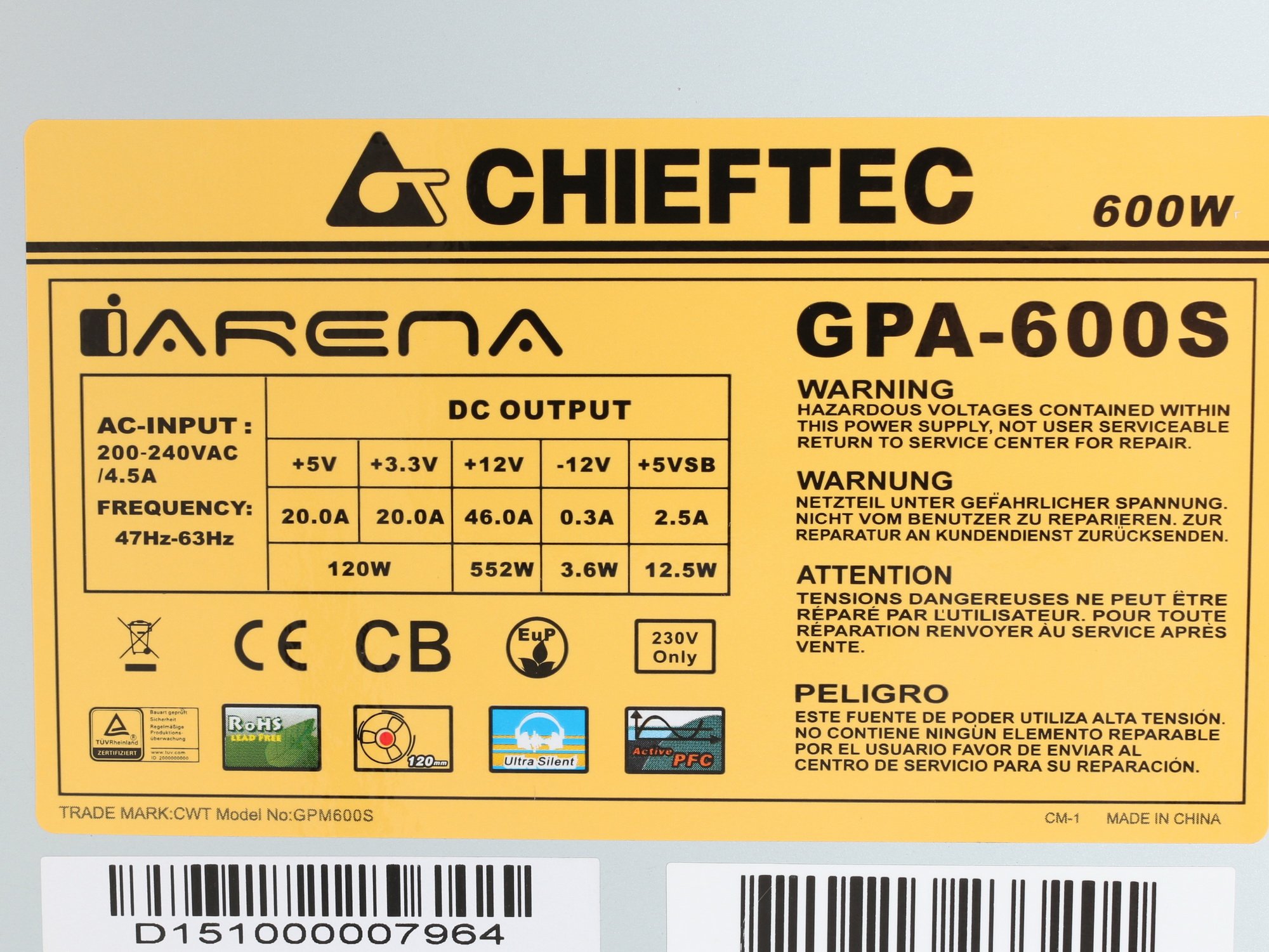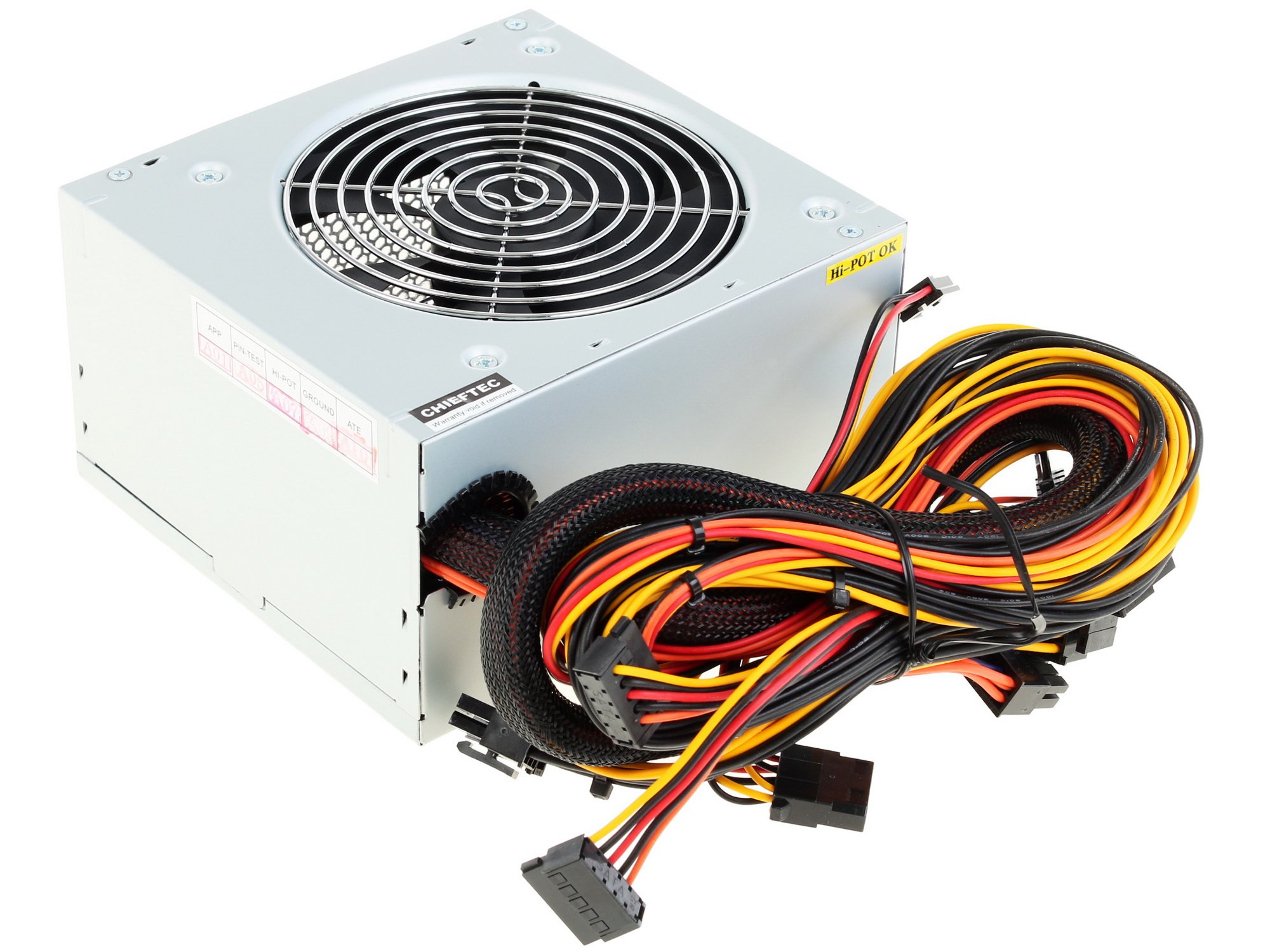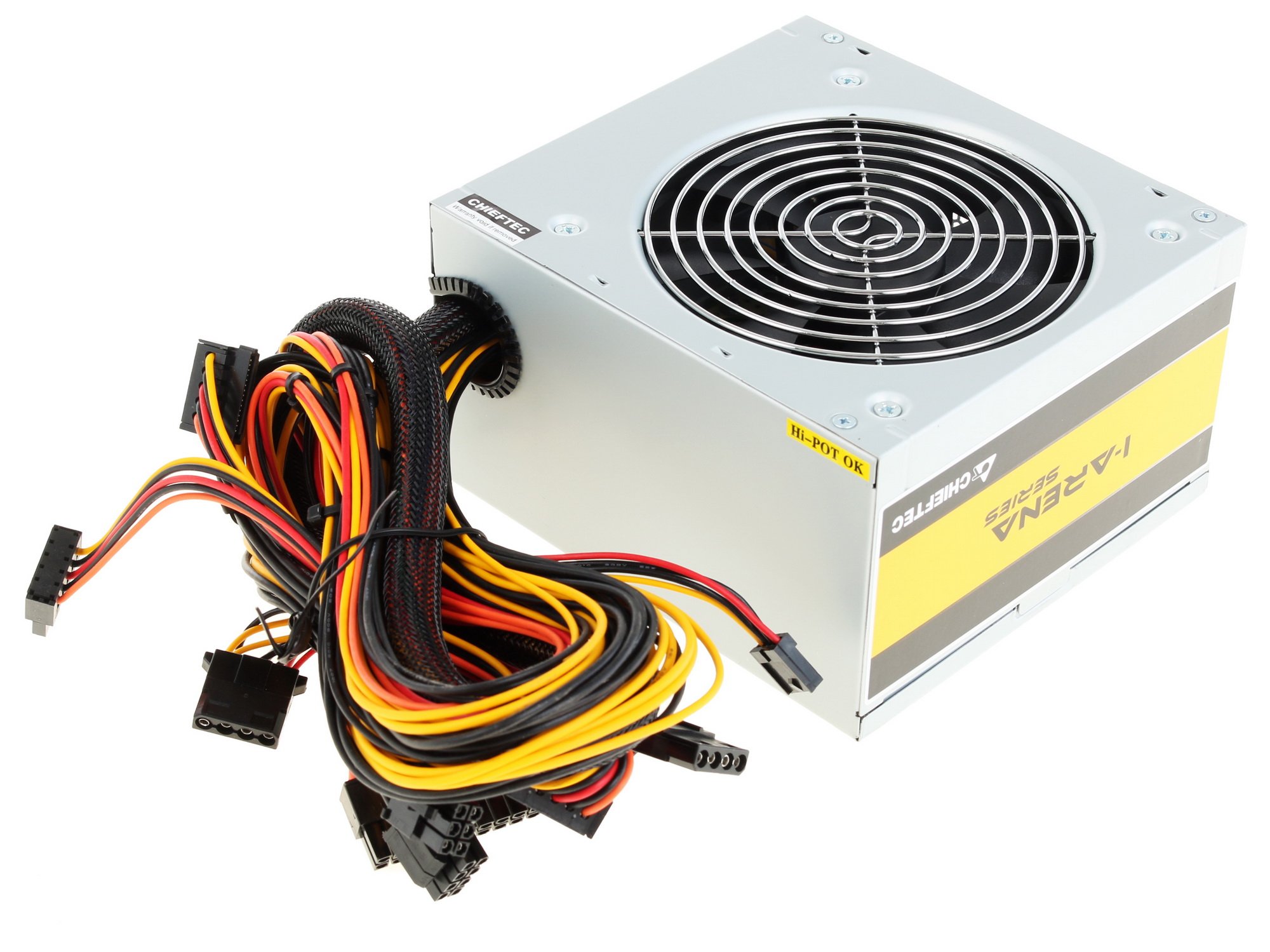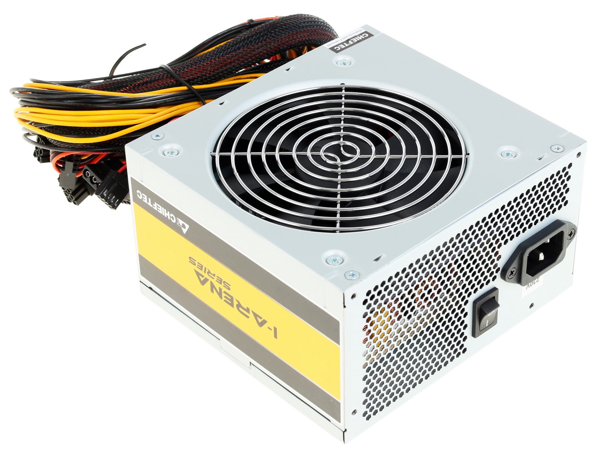 Блок питания Chieftec iARENA Series 600W имеет активную систему охлаждения в виде вентилятора диаметром 12x12 сантиметров. У блока питания нет излишеств в виде подсветки, оплетки проводов, отстегивающихся кабелей и прочих.
