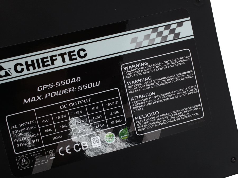 Модель Chieftec 550W имеет габариты 14x15x8.6 см и поставляется с необходимой документацией, крепежным комплектом и сетевым кабелем питания. Устройство дополнено активной системой охлаждения в виде вентилятора 12x12 см. Представленный блок питания дополнен основным и кабелем питания процессора длиной по 50 см.