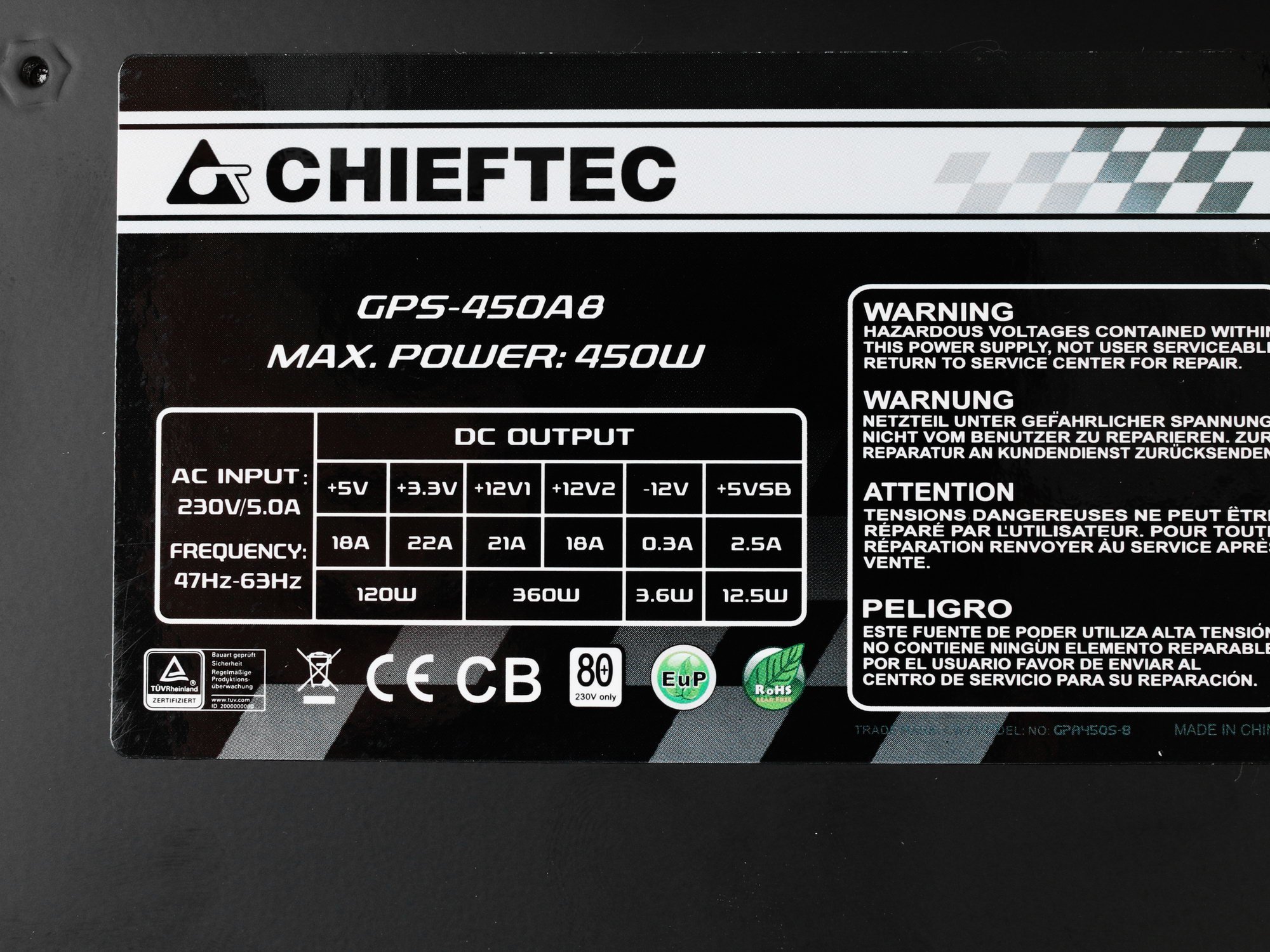 Блок питания Chieftec GPS-450A8, 450Вт, 80 PLUS, 120мм, черный