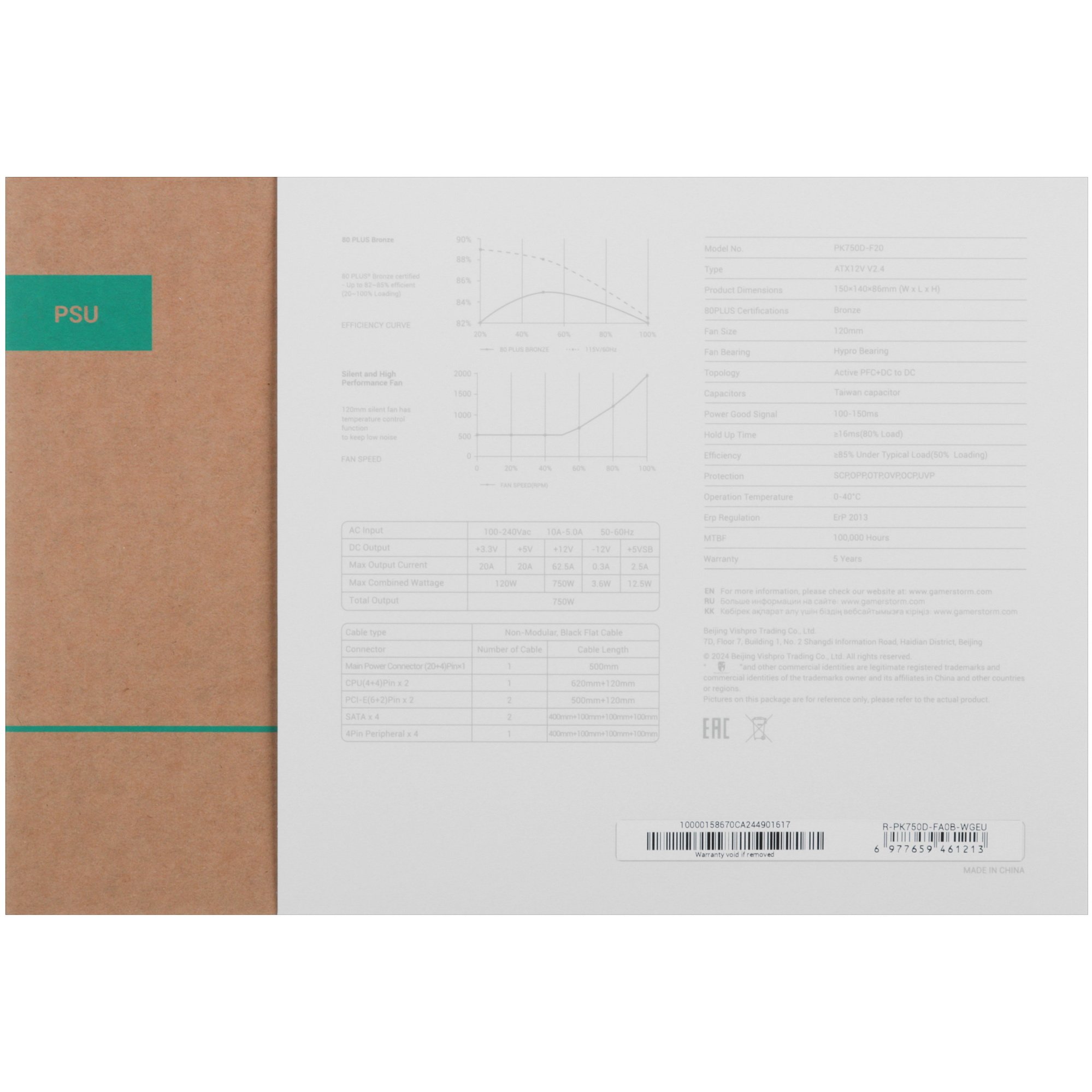 Блок питания Deepcool / GamerStorm PK750D, 750Вт, 80 PLUS Bronze, 120мм, черный