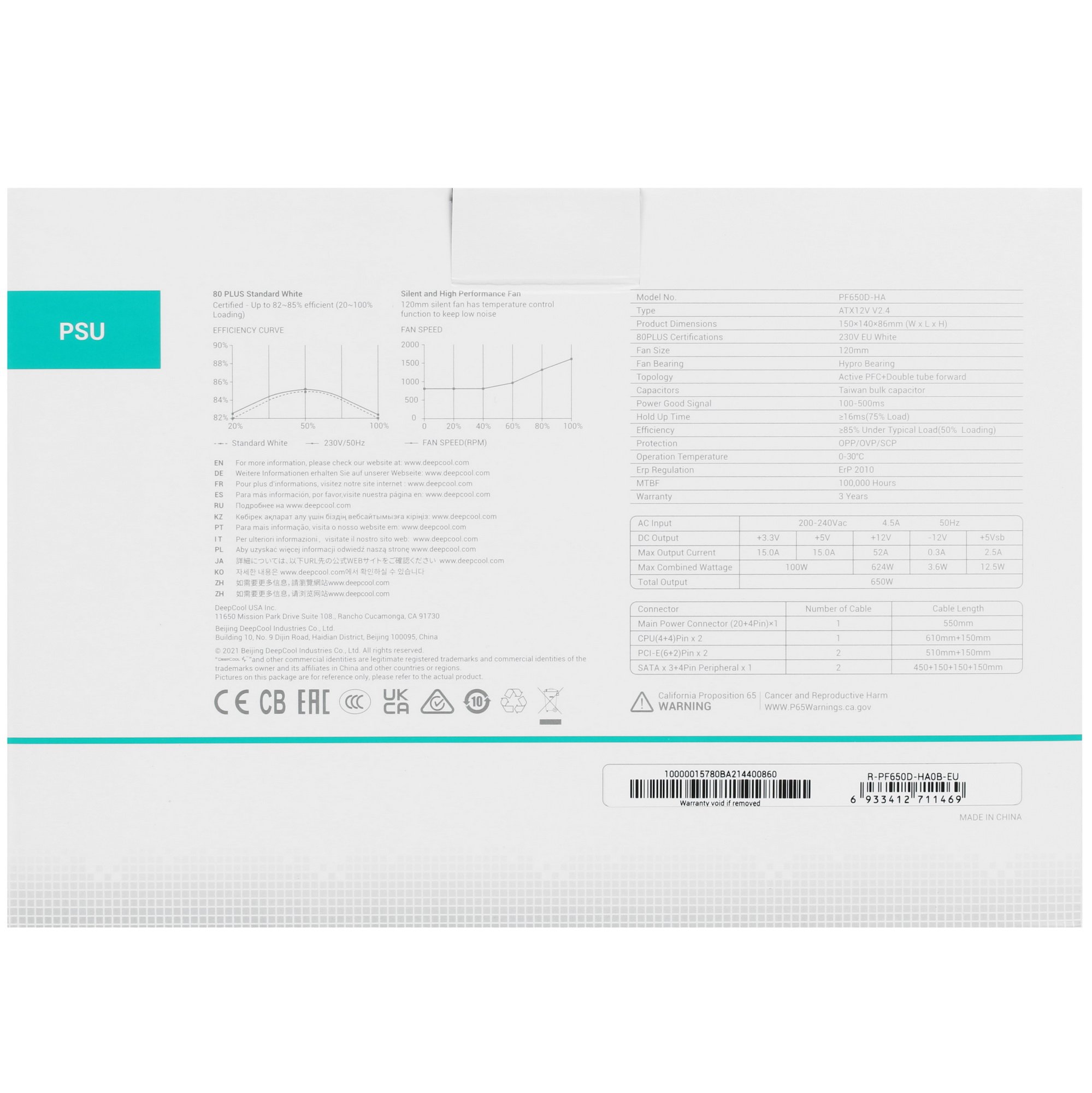 БП DEEPCOOL PF650 [R-PF650D-HA0B-EU] форм-фактора ATX получил сертификат энергоэффективности 80 PLUS Standart. Для стабильного отвода тепла под нагрузкой устройство оснащается активной системой охлаждения, в которую входит малошумный кулер размером 120x120 мм. Регулировка оборотов вентилятора осуществляется через ШИМ в соответствии с актуальным уровнем нагрузки БП.