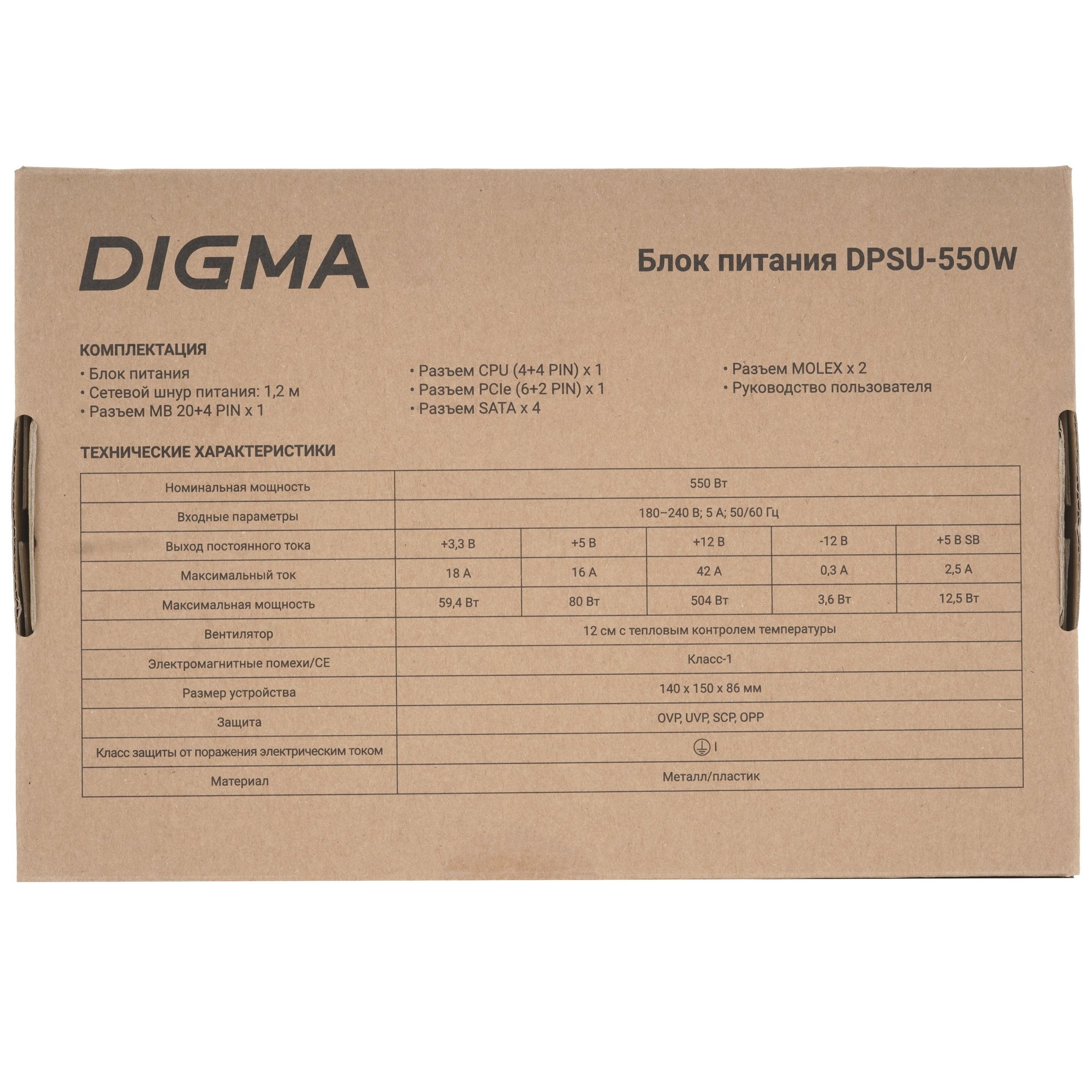 Блок питания Digma DPSU-550W представляет собой надежное решение для компьютерных систем среднего уровня мощности. С номинальной мощностью 550 Вт, этот блок питания соответствует стандарту ATX и оснащен основным 20+4-контактным разъемом для подключения к материнской плате, обеспечивая совместимость как со старыми, так и с более актуальными системами. Охлаждение обеспечивается 120-миллиметровым вентилятором, который способствует эффективному отводу тепла при работе, поддерживая стабильную температуру внутри корпуса.
