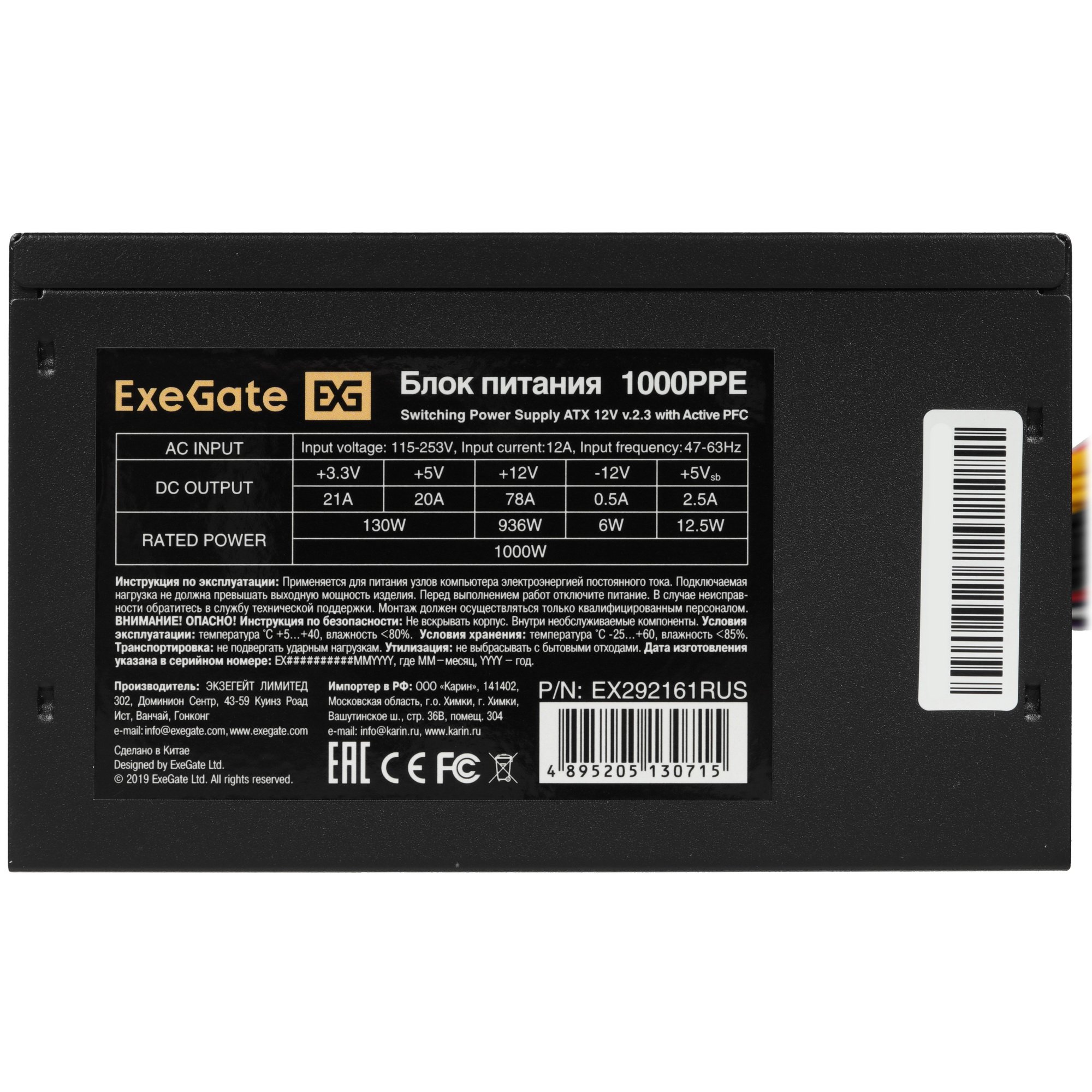 Блок питания ExeGate 1000PPE (EX292161RUS-PC), 1000Вт, 120мм, черный