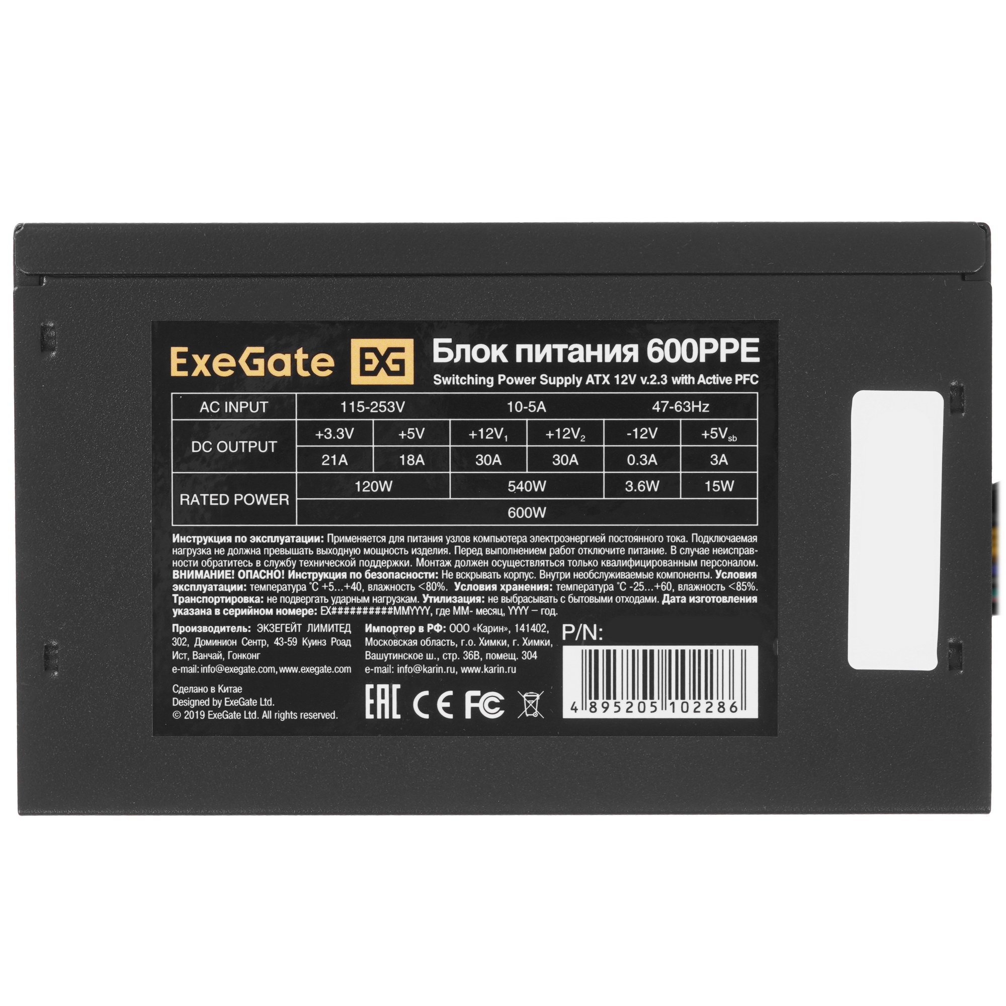 Блок питания ExeGate 600PPE (EX260643RUS), 600Вт, 120мм, черный