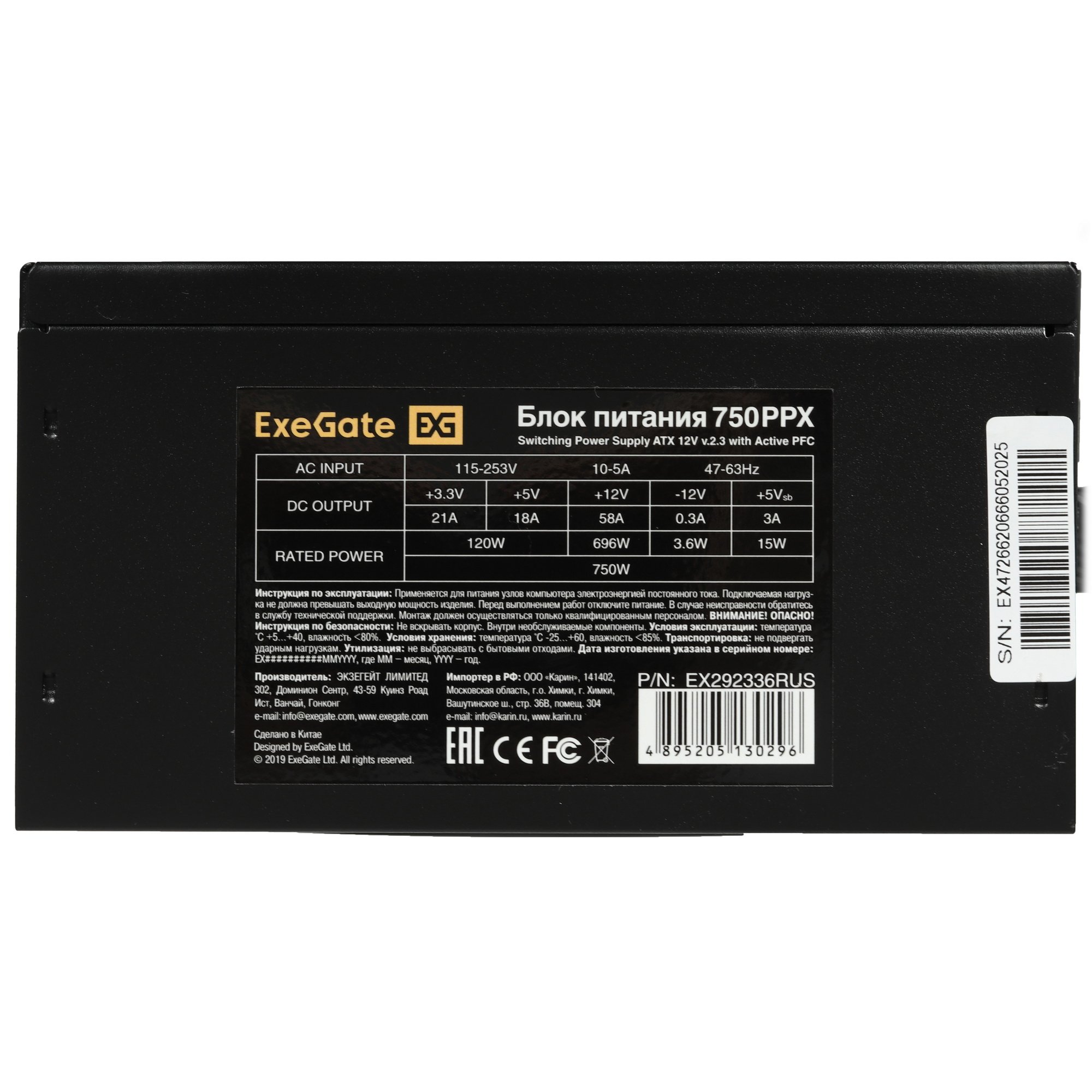 750-ваттный блок питания ExeGate 750PPX [EX292336RUS] черный рассчитан на оснащение игровых и производительных универсальных системных блоков. Мощность модели достаточна для стабильного функционирования многоядерного процессора, геймерской видеокарты, нескольких накопителей, вентиляторов, плат расширения и других комплектующих. Модель поддерживает наиболее востребованные защитные технологии – OCP, OPP, OTP, OVP, SCP и UVP. Благодаря полумодульной конструкции кабелей часть из них не используется. В результате повышается качество вентиляции и улучшается организация внутреннего пространства ПК.