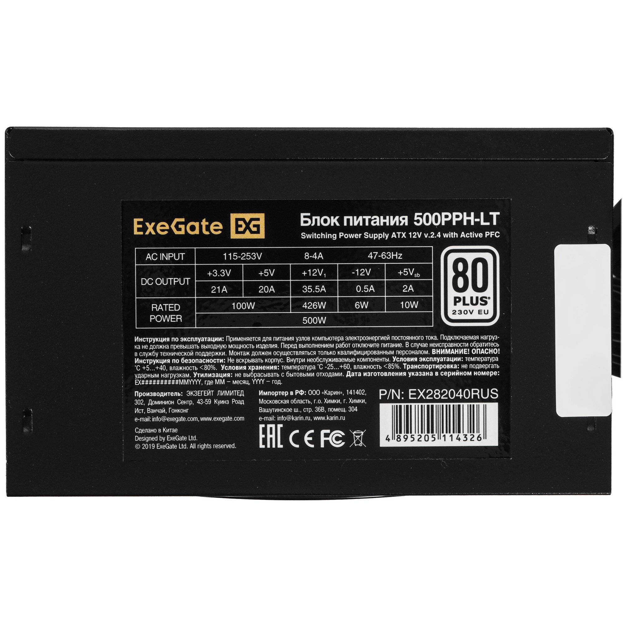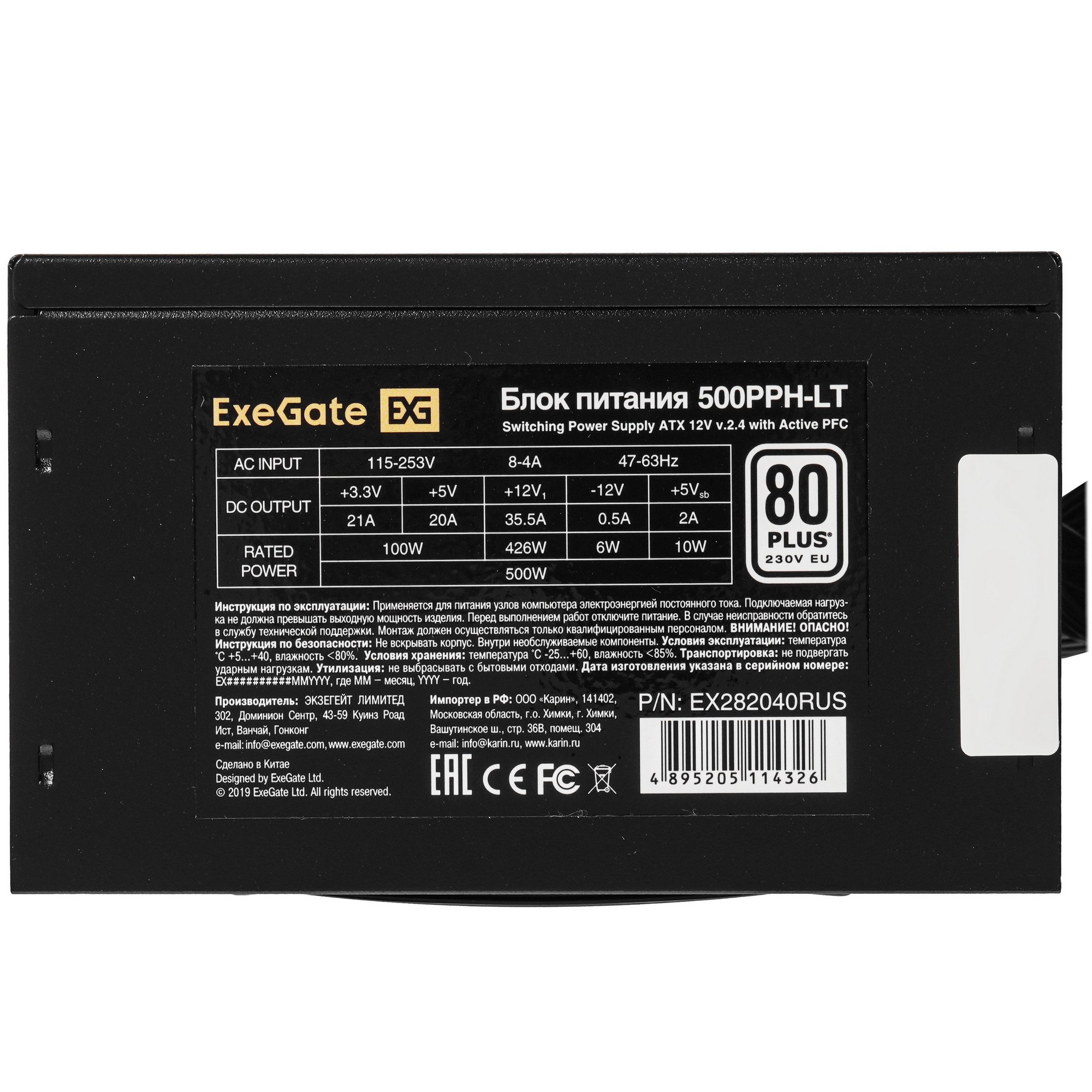 Блок питания ExeGate 500PPH-LT (EX282040RUS), 500Вт, 80 PLUS, 120мм, черный