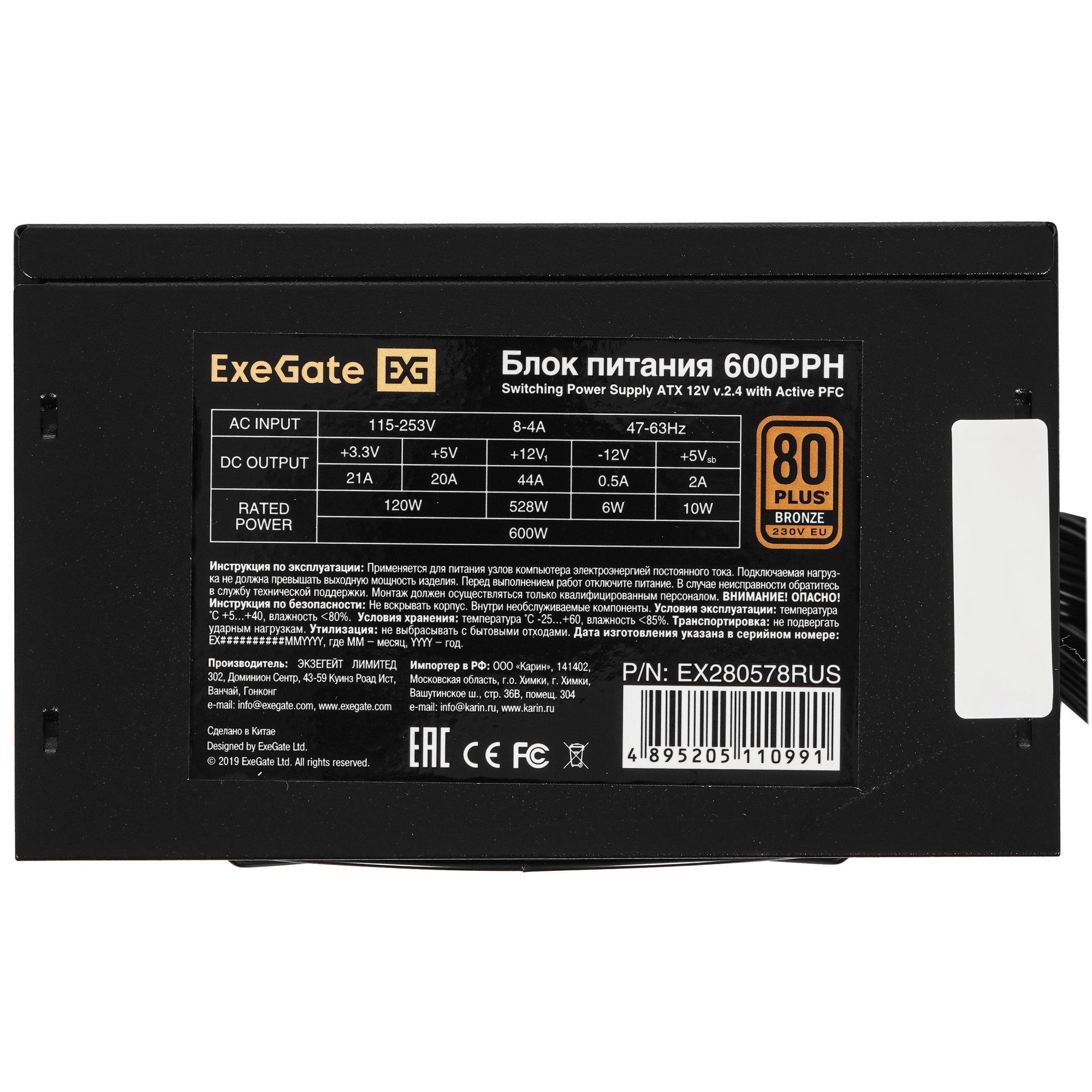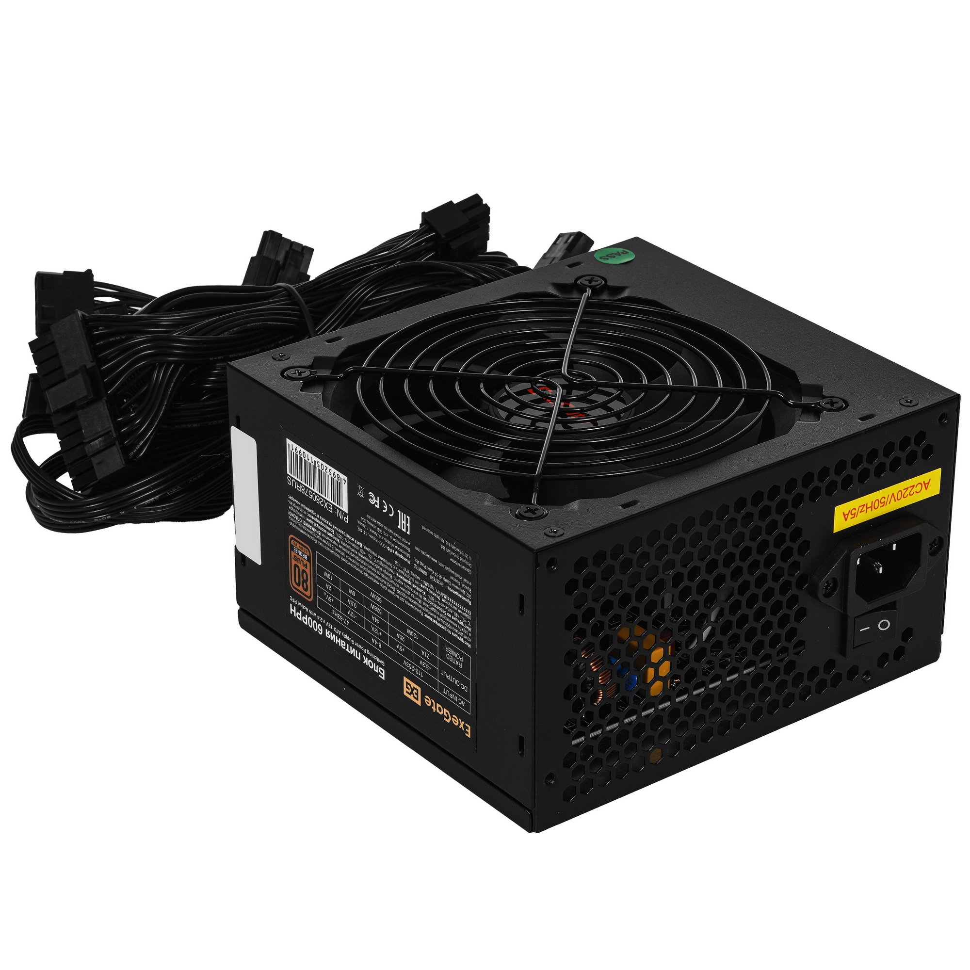 Блок питания ExeGate 600PPH RTL (EX280578RUS), 600Вт, 80 PLUS Bronze, 120мм, черный