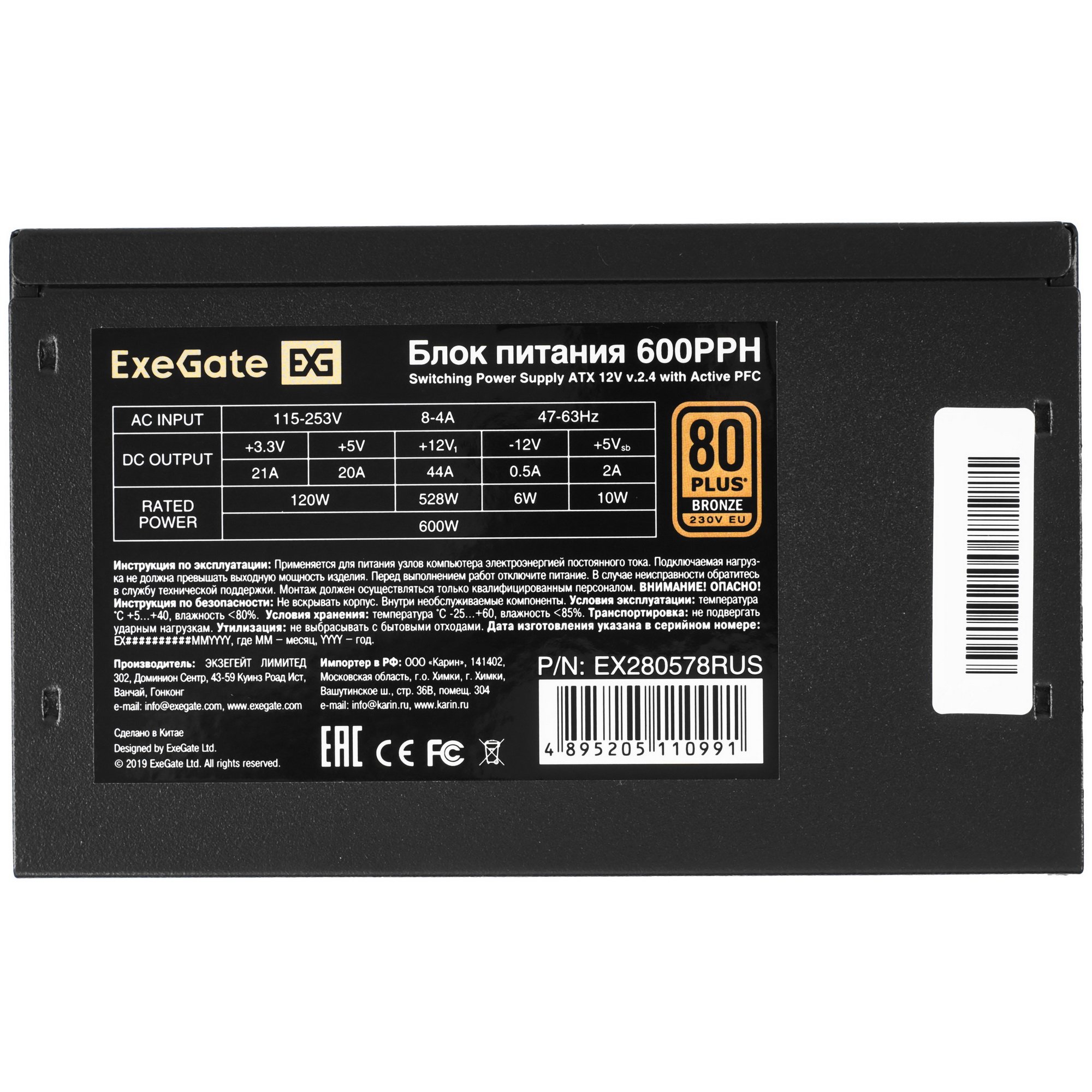 Блок питания ExeGate 600PPH-OEM (EX280578RUS-OEM), 600Вт, 80 PLUS Bronze, 120мм, черный