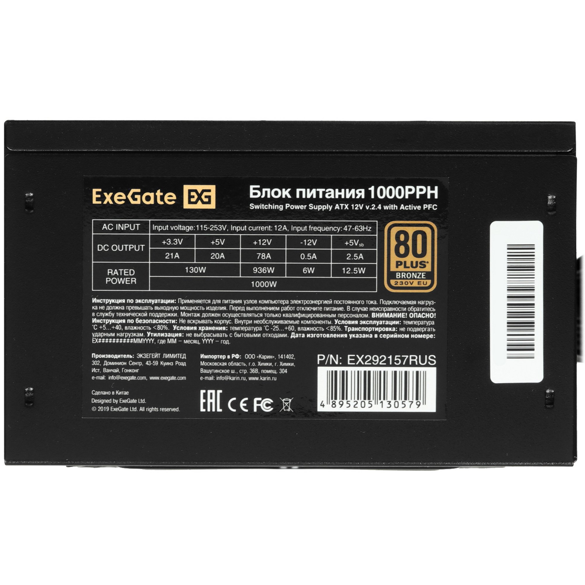 Блок питания ExeGate 1000PPH (EX292157RUS), 1000Вт, 80 PLUS Bronze, 120мм, черный