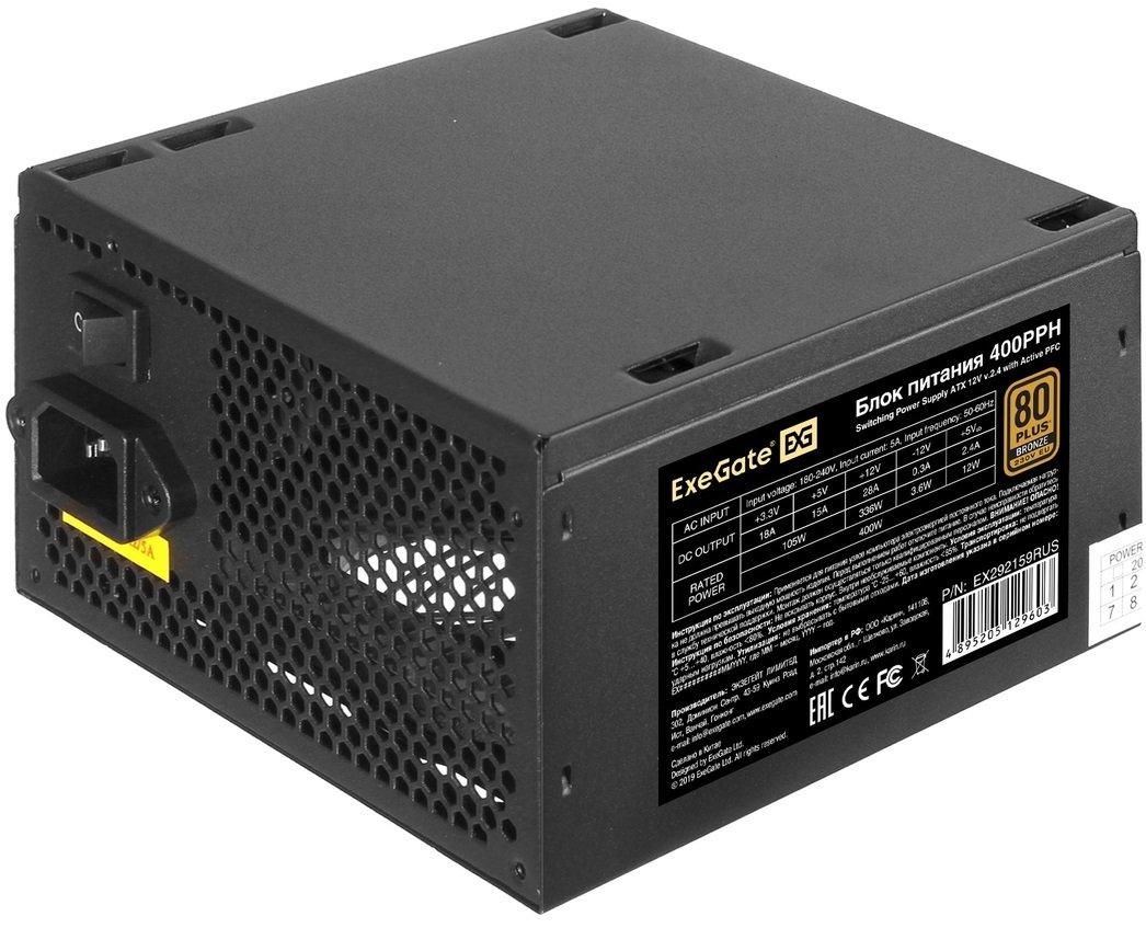 Блок питания ExeGate 400PPH (EX292159RUS), 400Вт, 80 PLUS Bronze, 120мм, черный