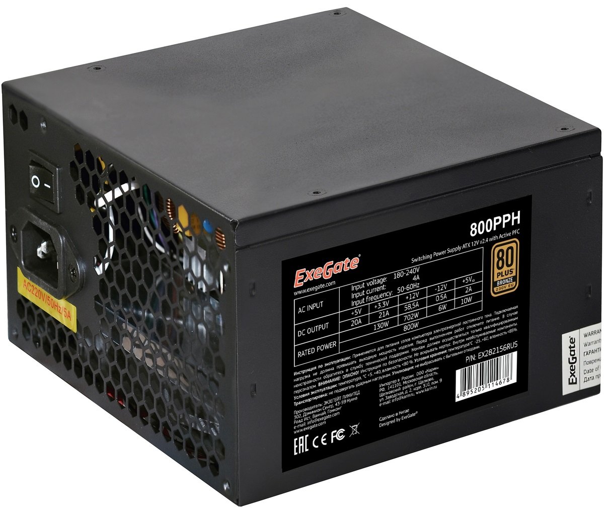 Блок питания ExeGate 800PPH (EX282156RUS), 800Вт, 80 PLUS Bronze, 120мм, черный