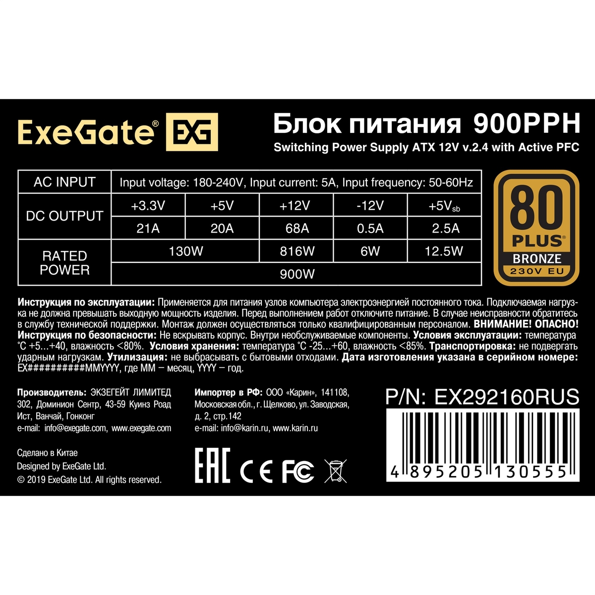 Блок питания ExeGate 900PPH (EX292160RUS-S), 900Вт, 80 PLUS Bronze, 120мм, черный