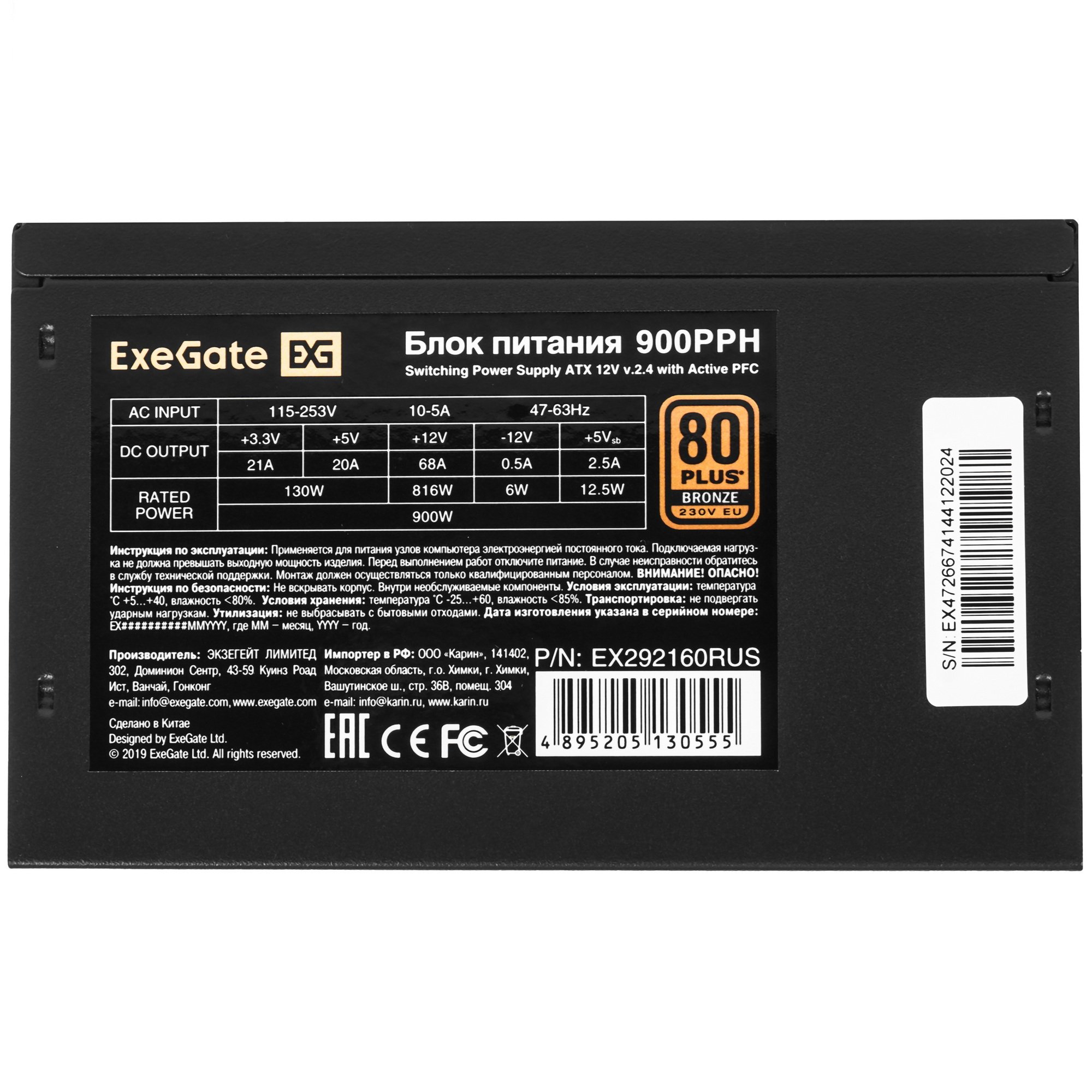 Блок питания ExeGate 900PPH-OEM (EX292160RUS-OEM-S), 900Вт, 80 PLUS Bronze, 120мм, черный