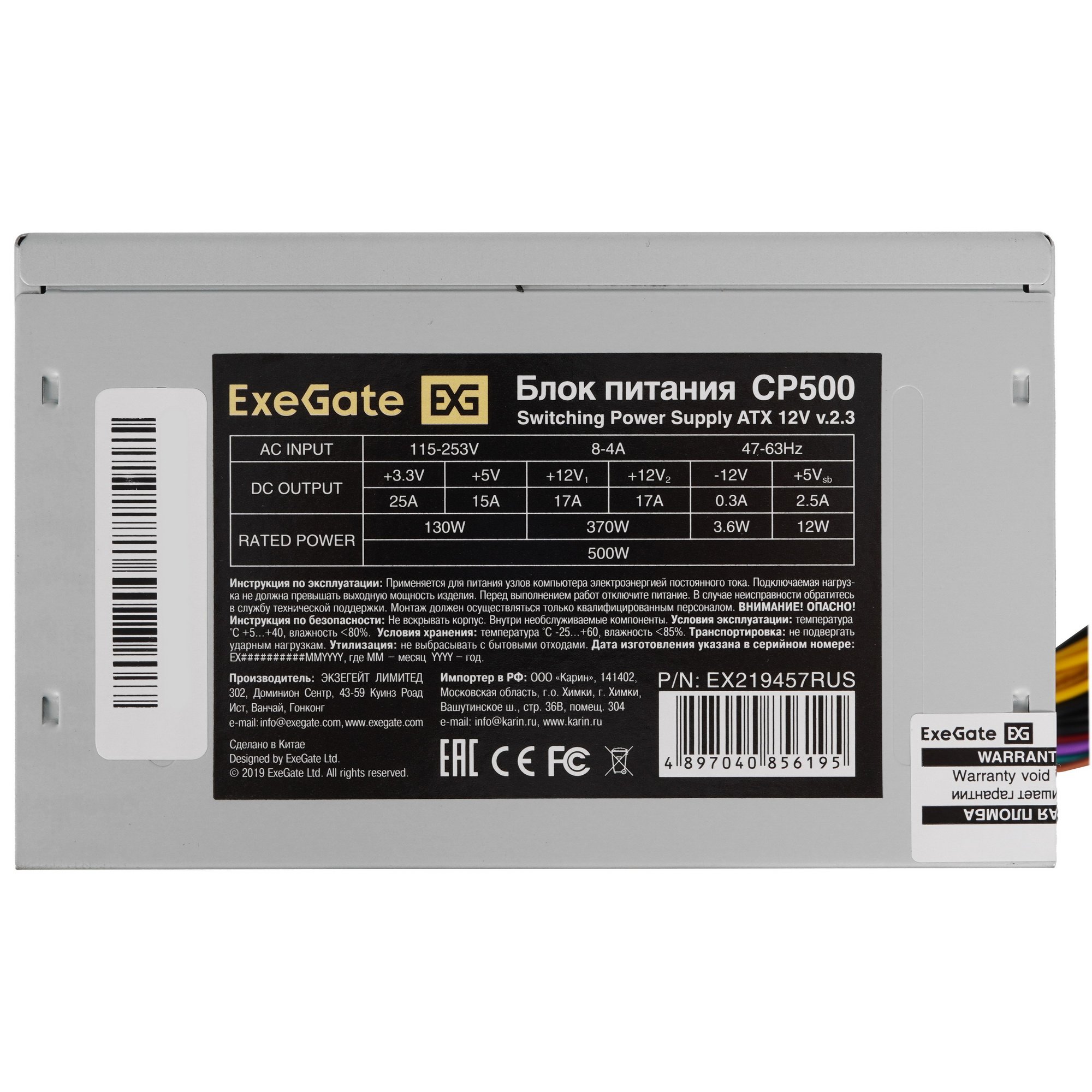 Блок питания ExeGate CP500 [EX219457RUS-S] с металлическим корпусом серого цвета выполнен в форм-факторе ATX и рассчитан на применение в системном блоке домашней станции. Компонент укомплектован как проводами для подачи энергии к потребителям постоянного тока – ЦПУ, материнской плате, накопителям, так и сетевым шнуром для подключения к розетке с фиксатором. Стабильная работа БП гарантирована при входном напряжении в диапазоне от 115 до 230 В.