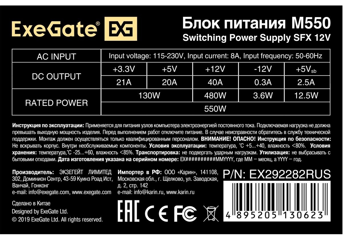Блок питания ExeGate M550 (EX292282RUS), 550Вт, 80мм, черный
