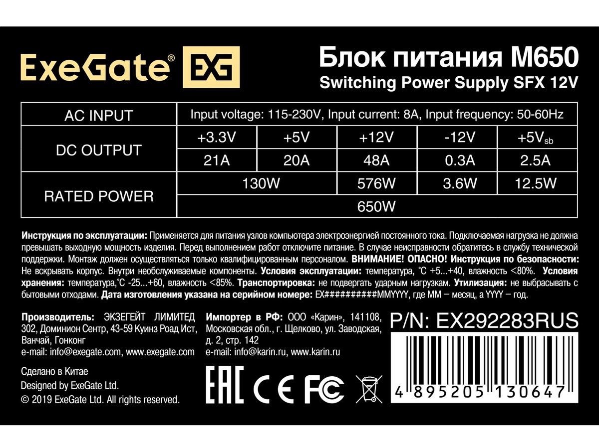 Блок питания ExeGate M650 (EX292283RUS), 650Вт, 80мм, черный