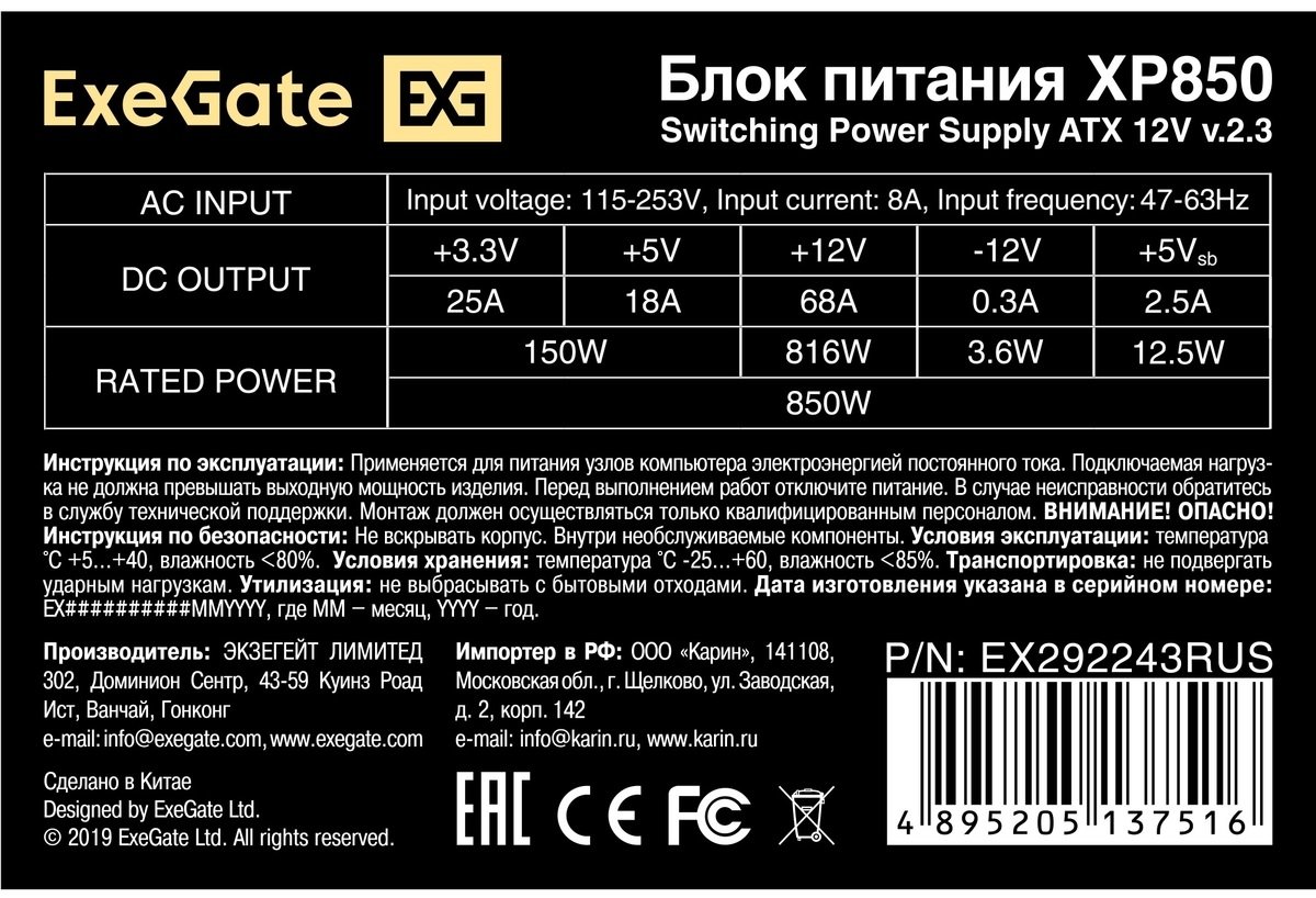 Блок питания ExeGate XP850 (EX292243RUS-PC), 850W, 120мм, черный