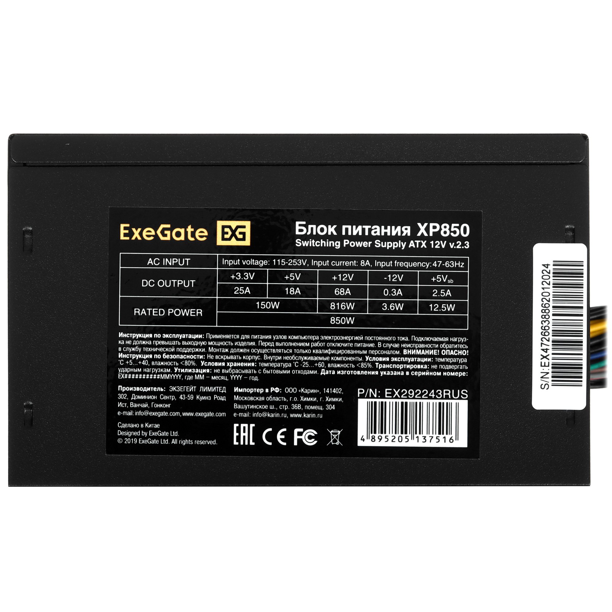 Блок питания ExeGate XP850 [EX292243RUS-S] в корпусе черного цвета станет удачным решением для снабжения всех потребителей мощного игрового ПК постоянным током. Модуль с выходной мощностью по всем линиям 850 Вт может стабильно питать компоненты при входном напряжении в сети питания 115-253 В и частоте тока 47-63 Гц. БП типоразмера ATX располагает кабелями для подключения к питанию центрального процессора (2x 4+4-pin), материнской платы (20+4-pin) и до 5 SATA-накопителей.