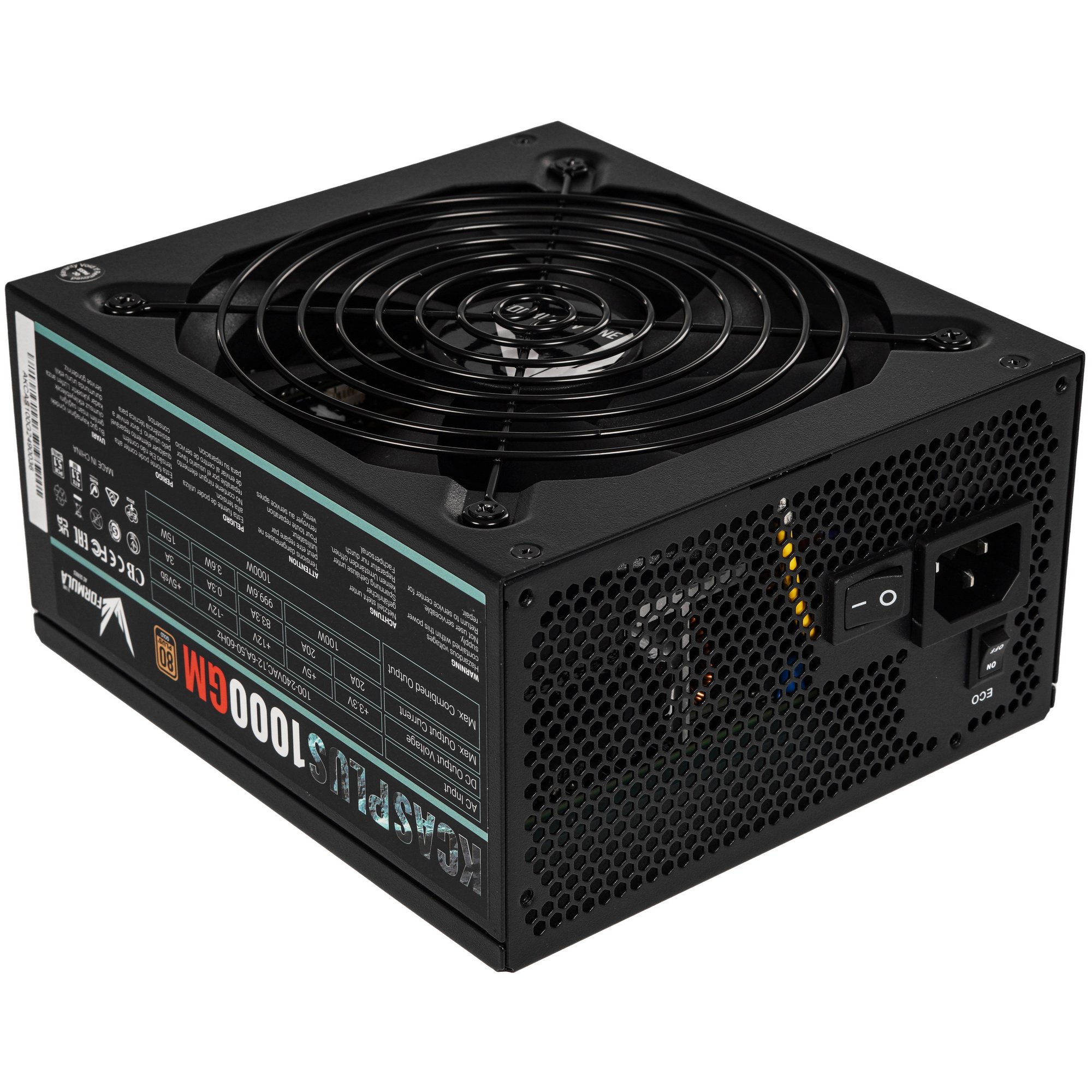 Блок питания Formula KCAS PLUS 1000GM оснащен тихим вентилятором 14x14 см с автоматической регулировкой оборотов в зависимости от степени нагрева и переключателем режима на корпусе. Сертификация по стандарту 80Plus Gold гарантирует эффективность 90% и выше. Широкий набор разъемов упрощает установку БП и подключение к нему процессора, видеокарты и прочей периферии. Активный корректор PFC стабилизирует входное напряжение, устраняет высокочастотные помехи, уменьшает нагревающие провода и прочие компоненты излишки мощности.