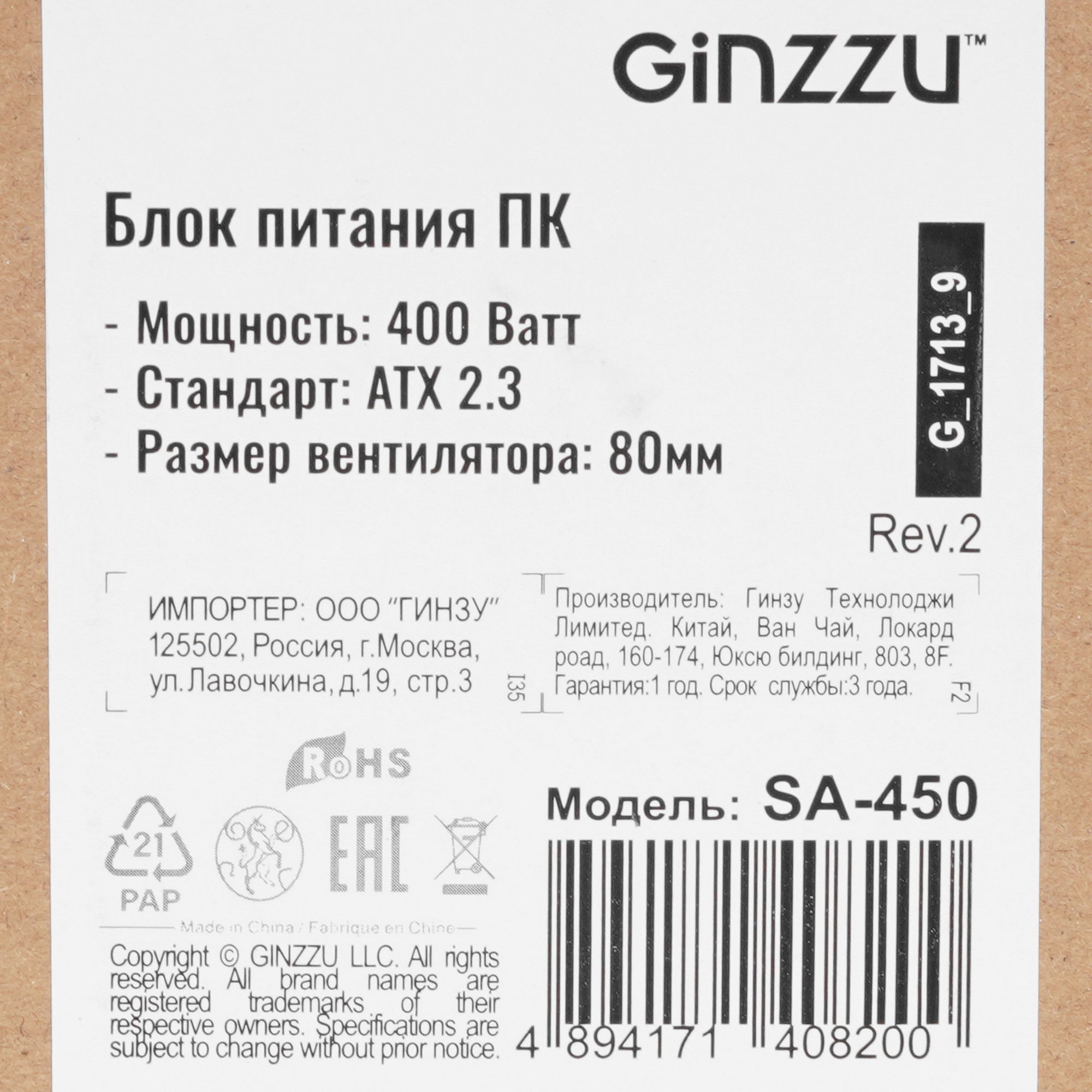 Блок питания Ginzzu SA450, 450Вт, 80мм, черный