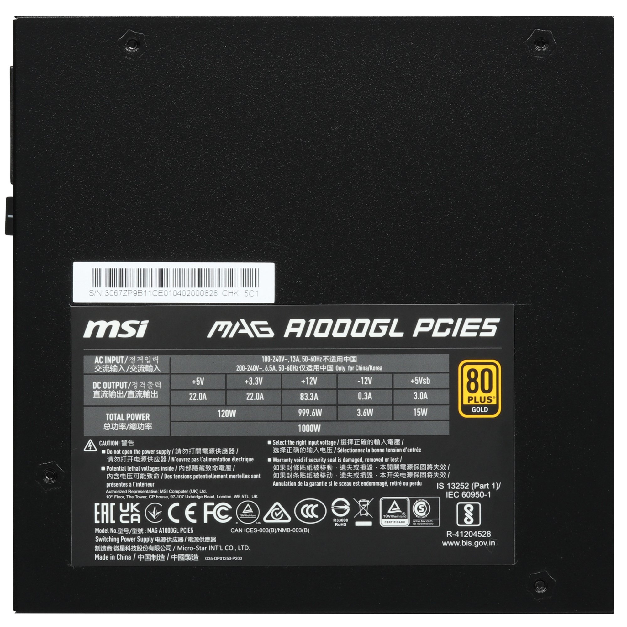 Блок питания MSI MAG A1000GL PCIE5 1000W, 80+ Gold, полностью модульный, ATX 3.0, PCIE5, RTL