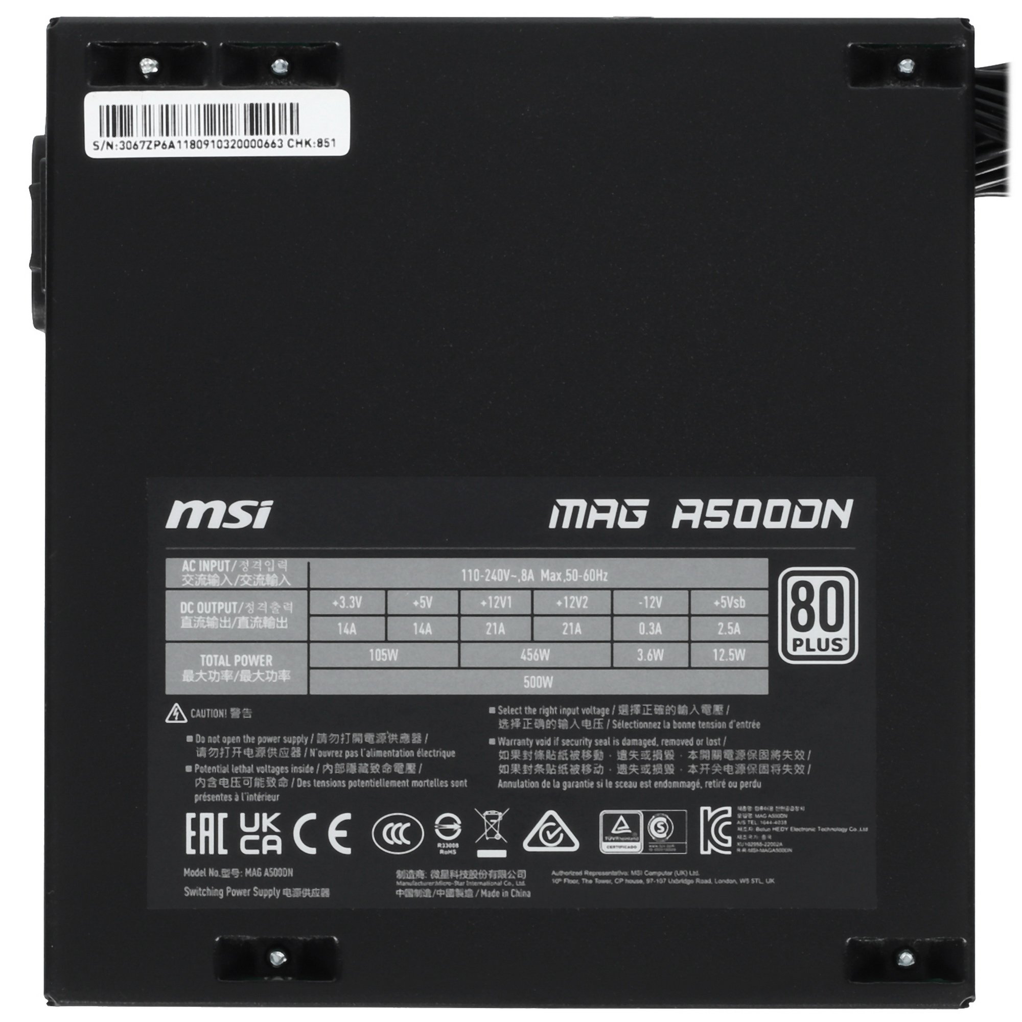 Блок питания MSI MAG A500DN с номинальной мощностью 500 Вт по линии 12 В станет стильным и надежным компонентом любой сборки. Устройство располагает интерфейсами 20+4 pin и 6+2 pin x2, которые обеспечат питанием процессор и видеокарту. Сама модель подключается к материнской плате при помощи востребованного разъема 20+4 pin. Блок питания обладает высокой энергоэффективностью в сочетании с низким энергопотреблением, что подтверждается сертификацией 80+ Standard.