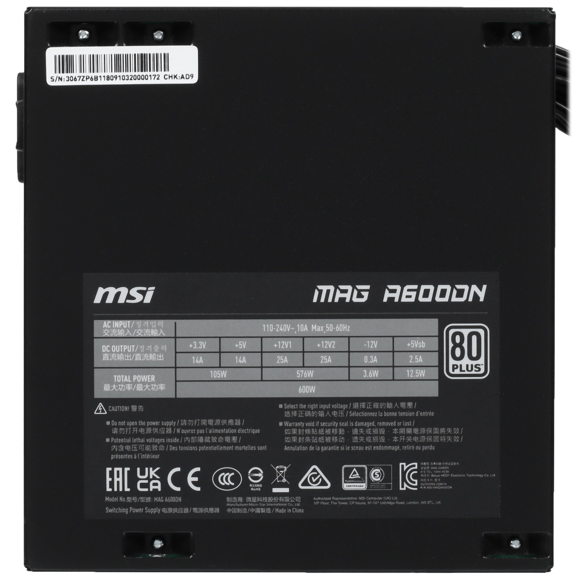 Блок питания MSI MAG A600DN (306-7ZP6B11-809), 600 Вт, 80 PLUS WHITE, 120 мм, черный