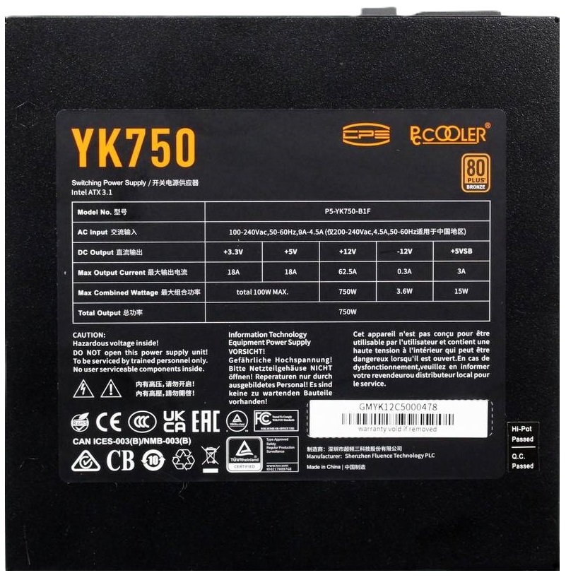 Блок питания PcCooler P5-YK750-B1F ATX 750W 80 PLUS Bronze, (20+4pin) APFC 135мм fan 6xSATA Cab Manag RTL