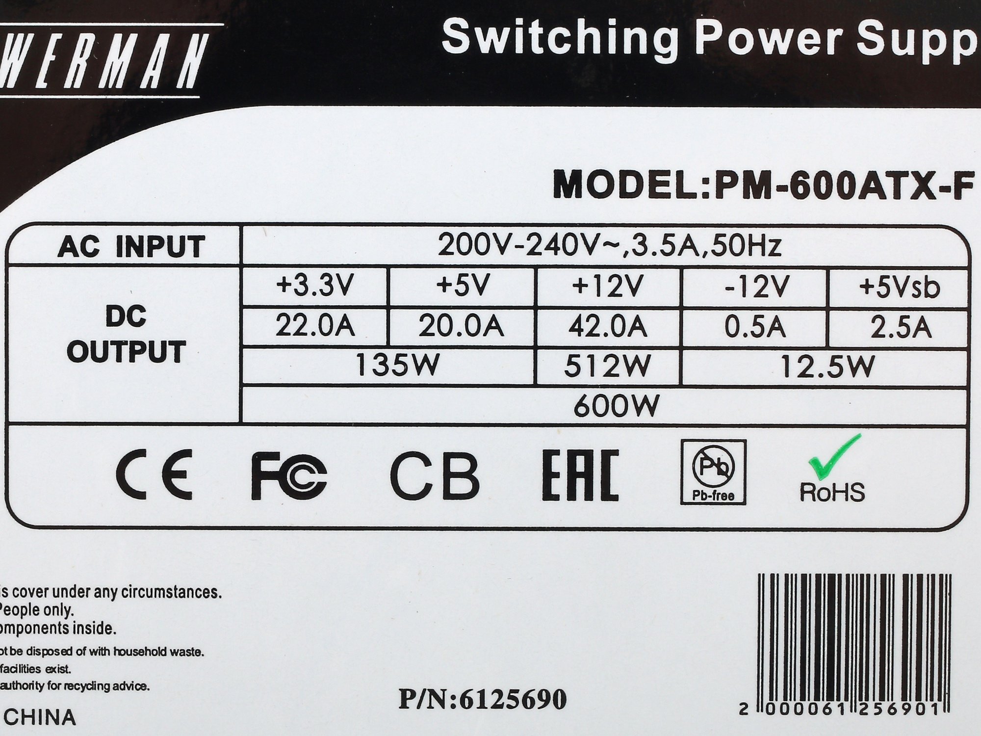 Блок питания Powerman 600W [PM-600ATX-F] в корпусе серого цвета обеспечивает полную выходную мощность на уровне 600 Вт и может обеспечивать энергией все компоненты системного блока домашней станции со средним энергопотреблением, офисного компьютера. Он принадлежит к числу моделей форм-фактора ATX и предполагает работу при уровне входного напряжения 230 В. БП предлагается вам без сетевого кабеля питания для подключения к розетке, который вы сможете приобрести отдельно.