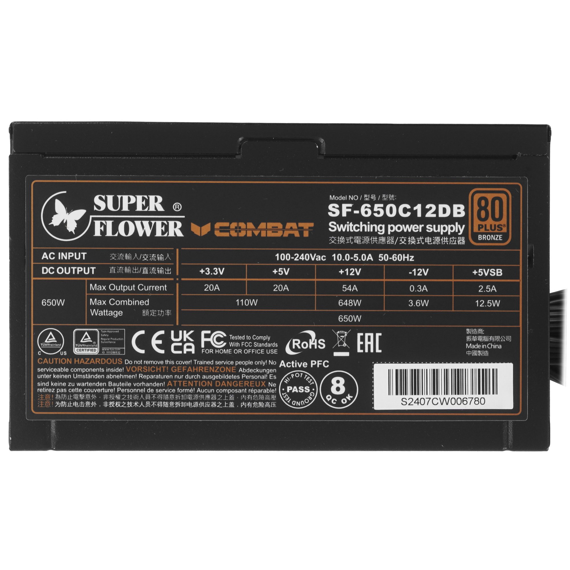 Блок питания 650Вт/ Power Supply Super Flower Combat DB, 650W, ATX, 120мм, 4xSATA, 3xPCI-E(6+2), APFC, 80 PLUS Bronze, non-Modular
