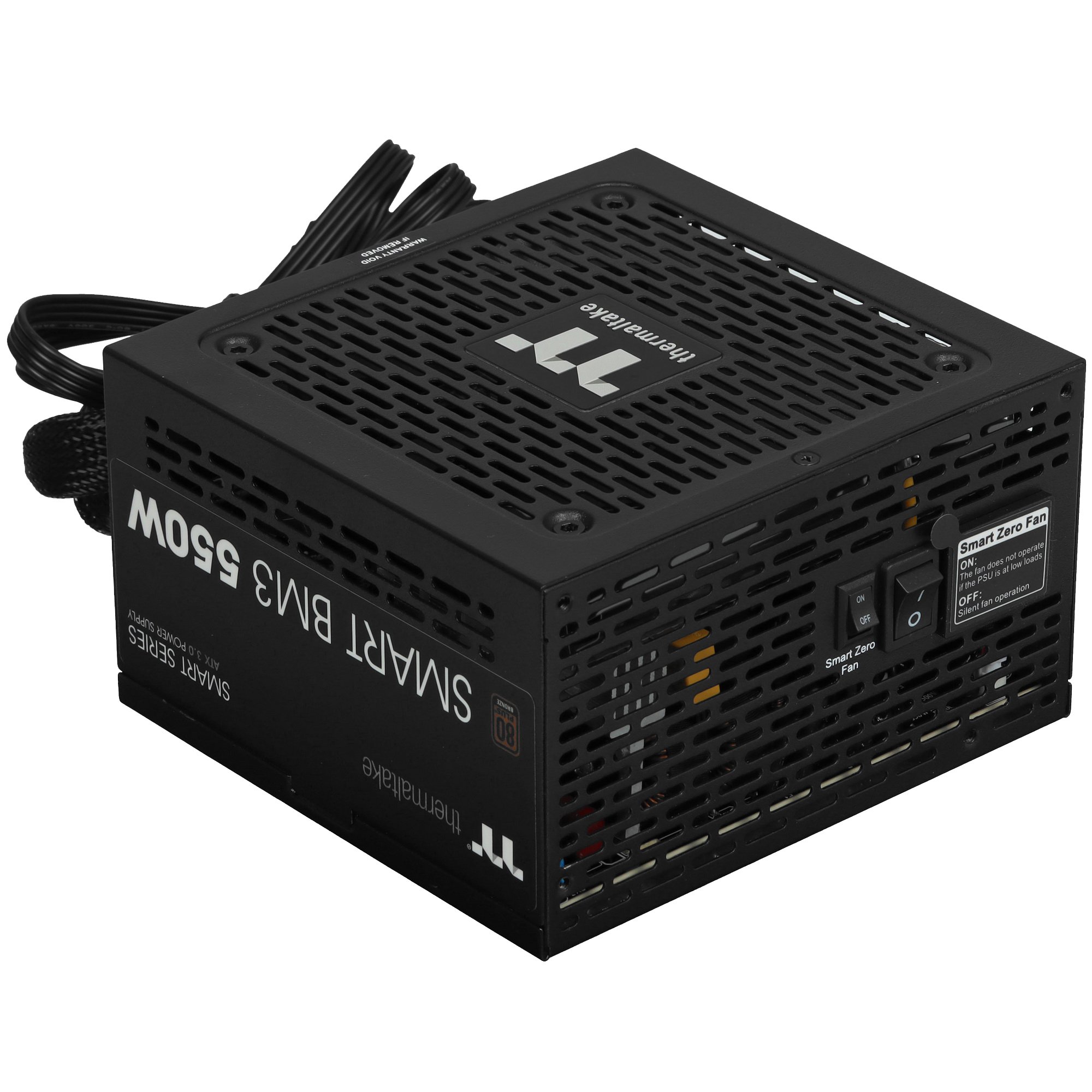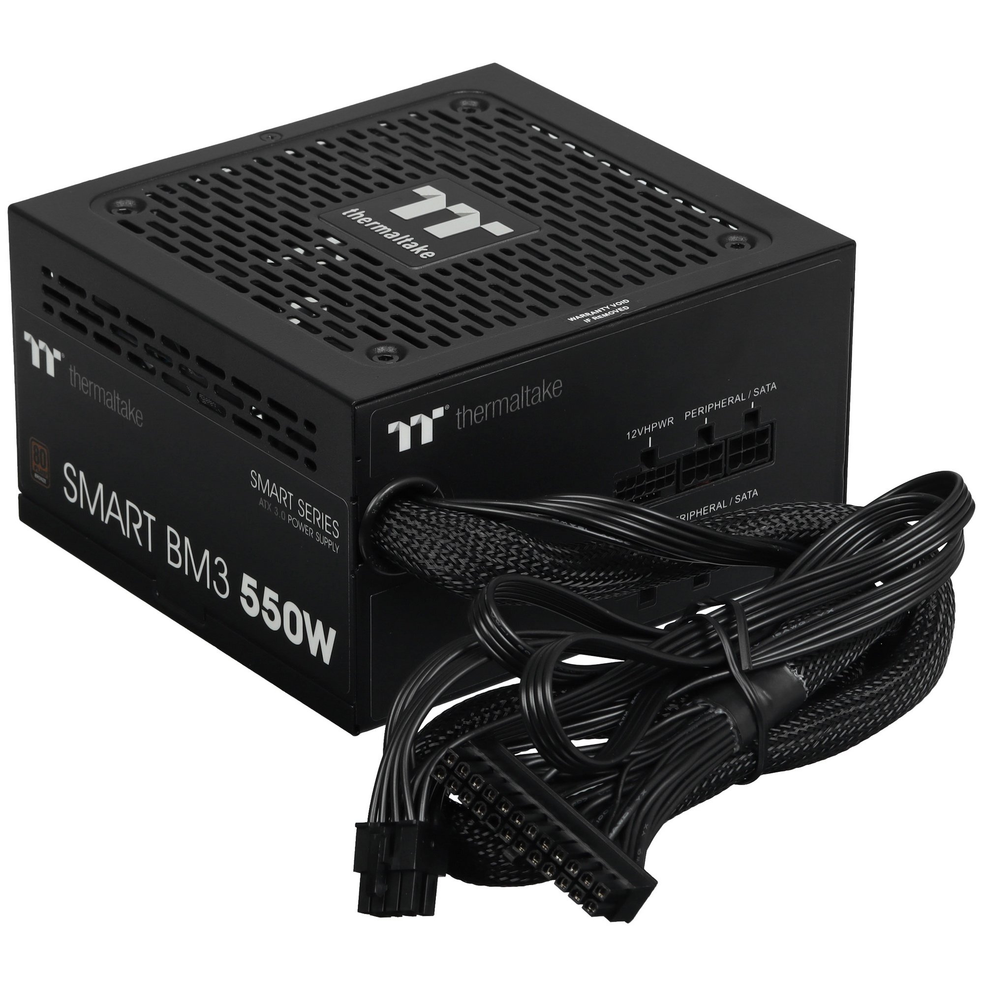 Thermaltake Smart BM3 550W соответствует стандарту ATX 3.0 и оснащен активной коррекцией коэффициента мощности (APFC), что обеспечивает стабильную подачу питания и повышает надежность работы. Блок питания оборудован 120-мм вентилятором с управляемой скоростью вращения (SM), что обеспечивает эффективное охлаждение при минимальном уровне шума. Набор разъемов включает 20+4-контактный разъем для материнской платы, два 4+4-контактных разъема для процессора, два (6+2pin) PCI-E разъема для видеокарт, три разъема SATA для накопителей, а также разъем 12VHPWR для поддержки видеокарт.