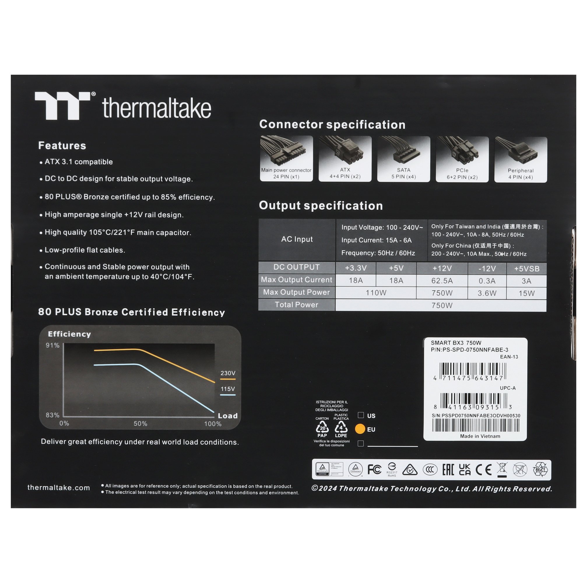 Серяи Smart BX3 полностью соответствует спецификациям Intel ATX 3.1, что позволяет выдерживать скачок мощности до 200%, достигать эффективности до 60% при низкой нагрузке и соответствовать требуемым временным задержкам при работе.