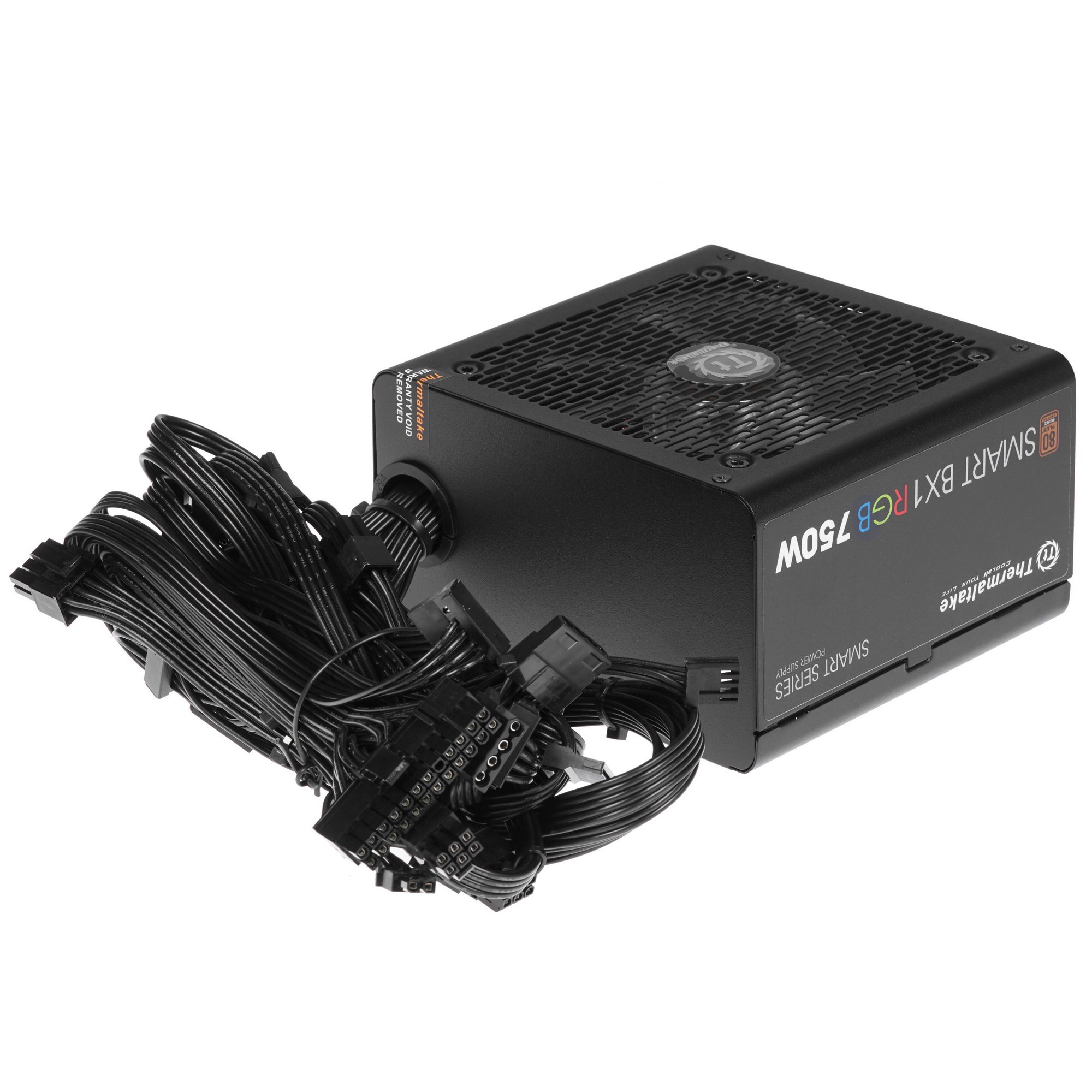 Блок питания Thermaltake Smart BX1 RGB 750W [PS-SPR-0750NHSABE-1] – один из важных компонентов компьютерной сборки. Необходим он для обеспечения комплектующих электрической энергией. БП имеет сертификат 80 PLUS Bronze. У него высокий КПД, а при трансформации электрического тока потери небольшие.