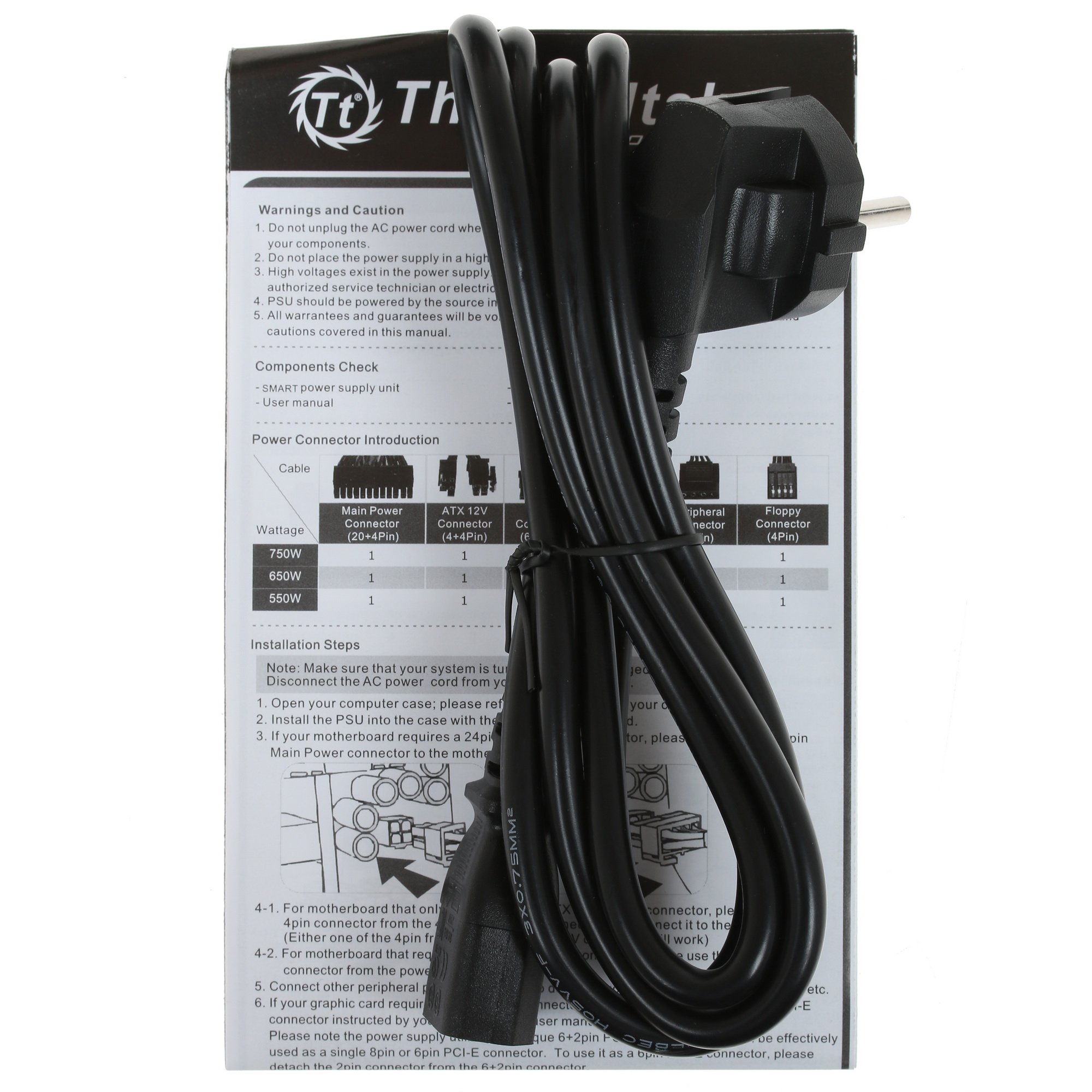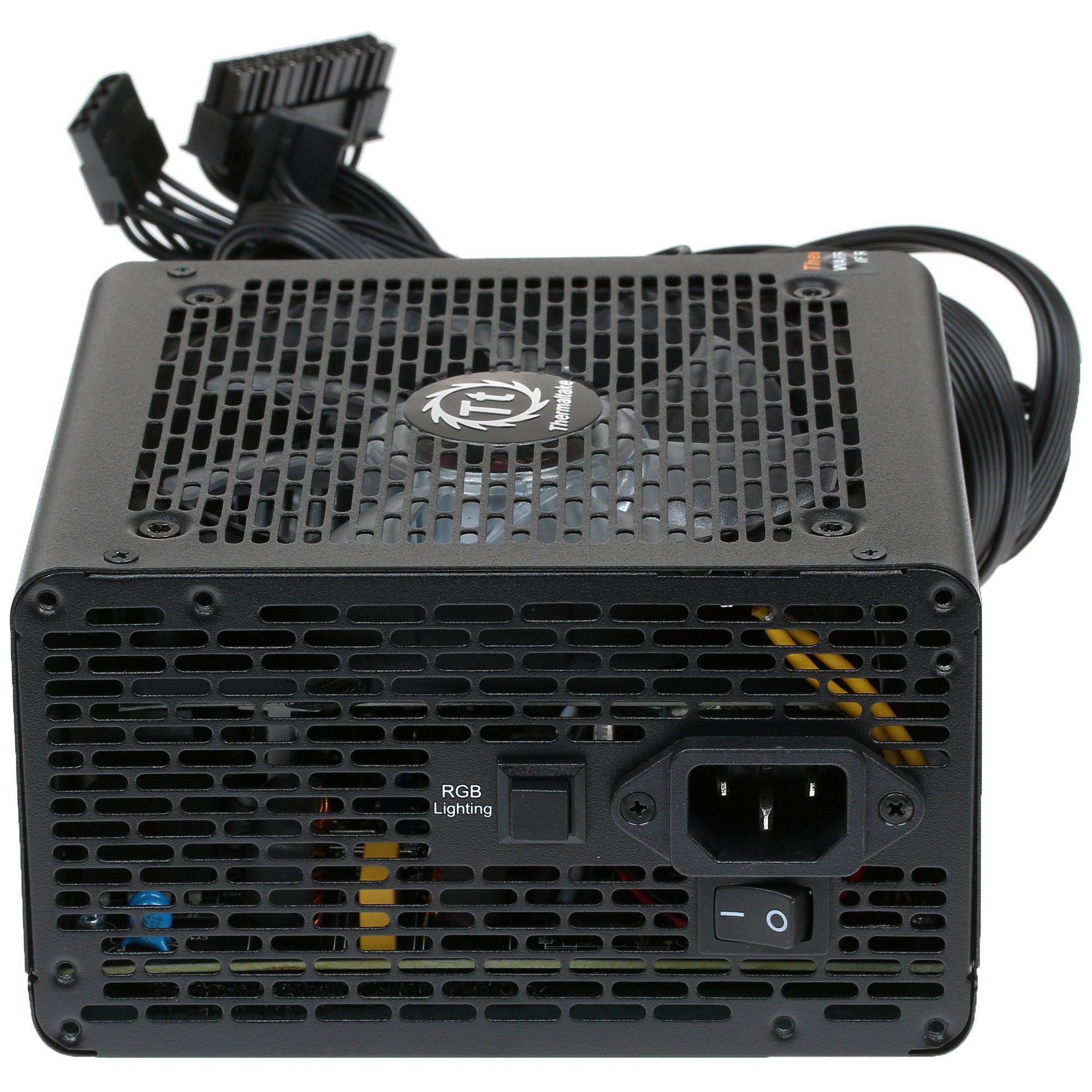 Блок питания Thermaltake Smart BX1 RGB 550W [PS-SPR-0550NHSABE-1] в черном корпусе демонстрирует общую выходную мощность по всем линиям 550 Вт (номинал), являясь оптимальным вариантом для домашней станции с обширным функционалом или рабочего ПК. Данная модель оснащается кабелями с коннекторами 24+4+4, 6x SATA и 2x PCI-E (6+2) для присоединения компонентов системного блока. Длина кабеля с основным коннектором питания составляет 60 мм, а к центральному процессору идет кабель длиной 65 мм.