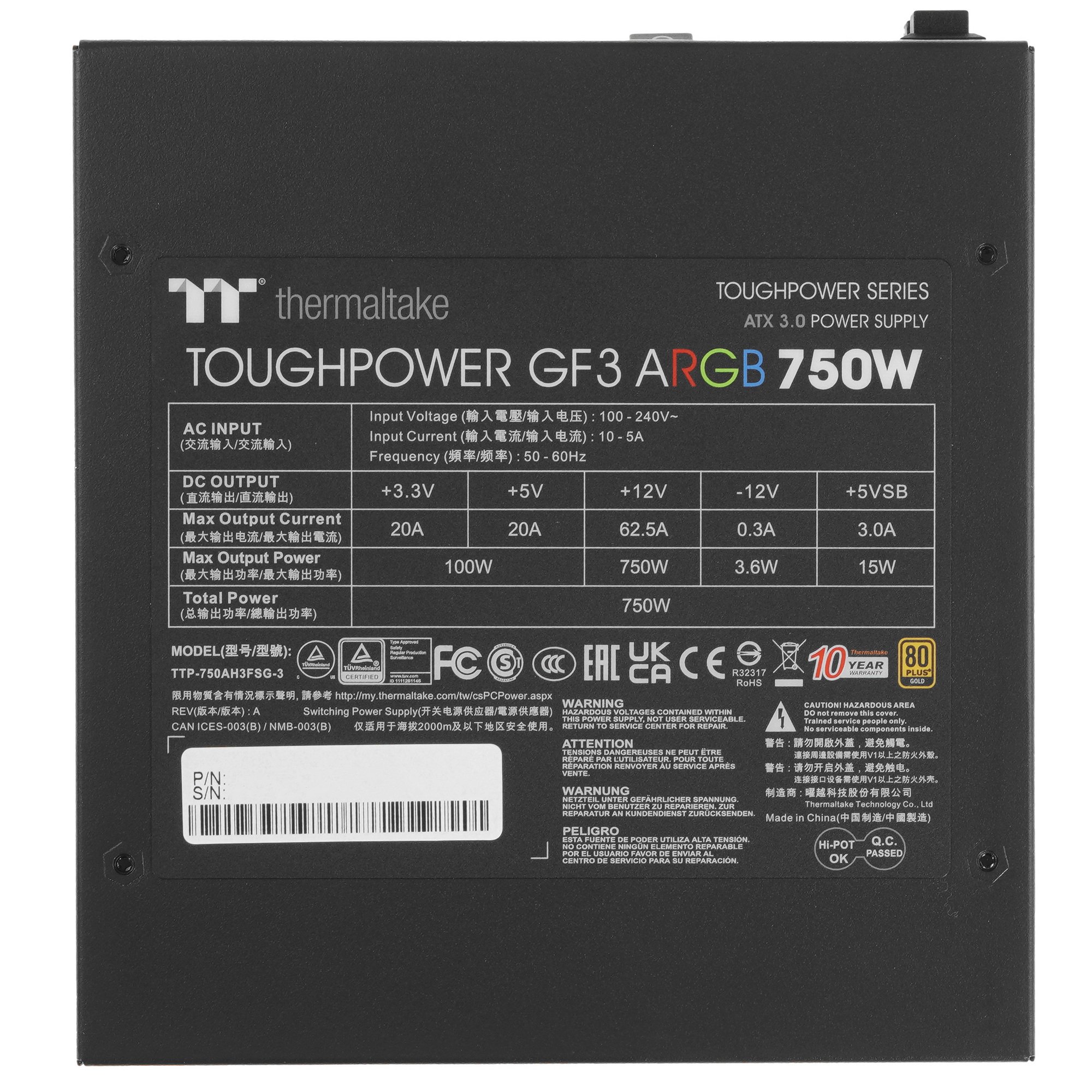 Блок питания Thermaltake Toughpower GF3 ARGb (PS-TPD-0750F4FAGE-1), 750Вт, 80 PLUS Gold, 140мм, модульный, черный