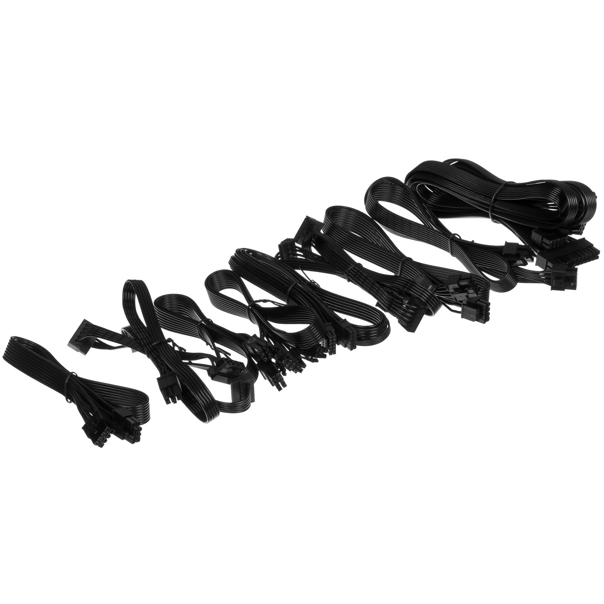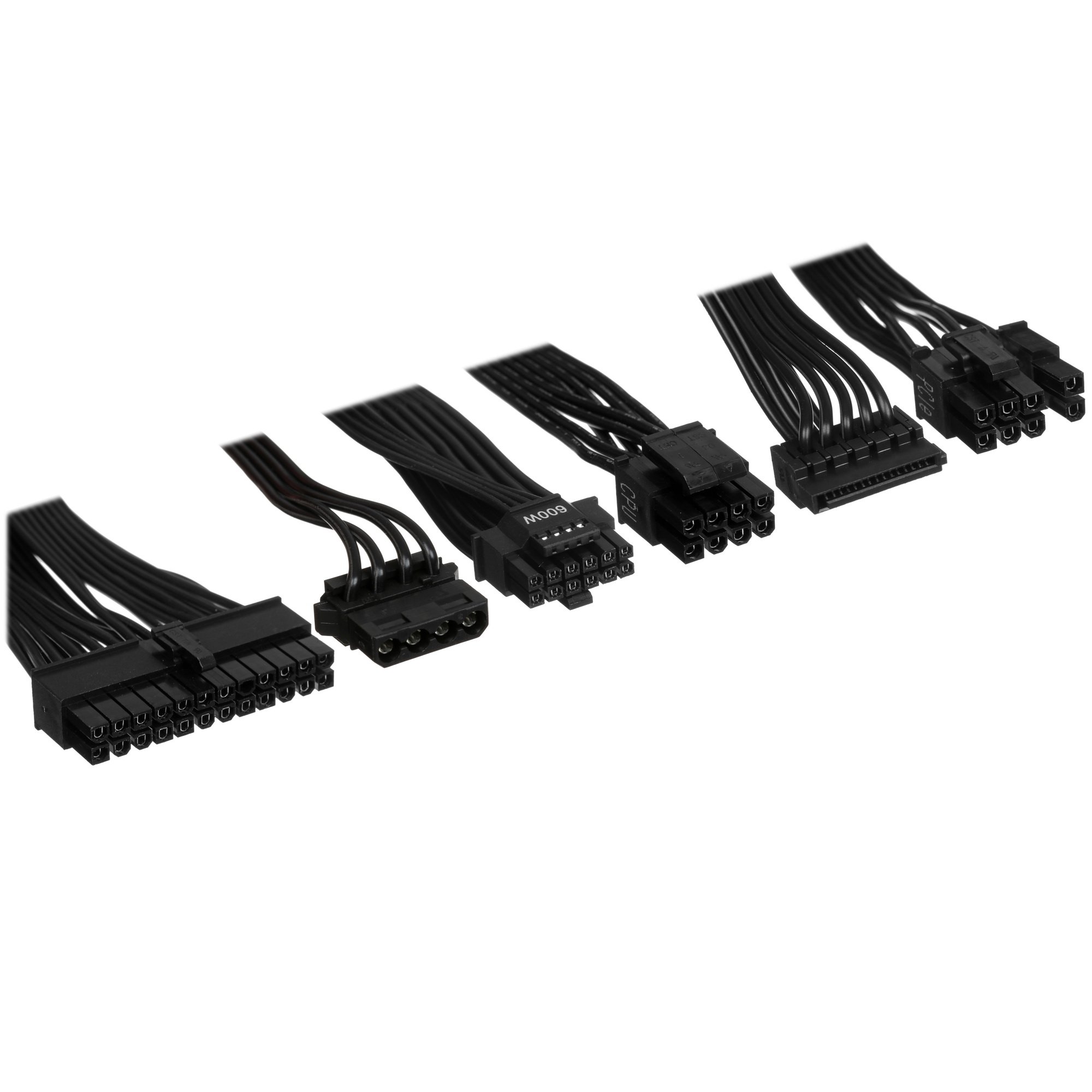 Модульная конструкция и разнообразие разъемов обеспечивают гибкость при сборке системы. Блок питания включает 24-контактный основной разъем для материнской платы, два 4+4-контактных разъема для процессора, три 6+2-контактных PCI-E для видеокарт, шесть разъемов SATA и два разъема 12V с конфигурацией 6x2, обеспечивая отличную совместимость с комплектующими и позволяя создавать мощные игровые и рабочие системы.