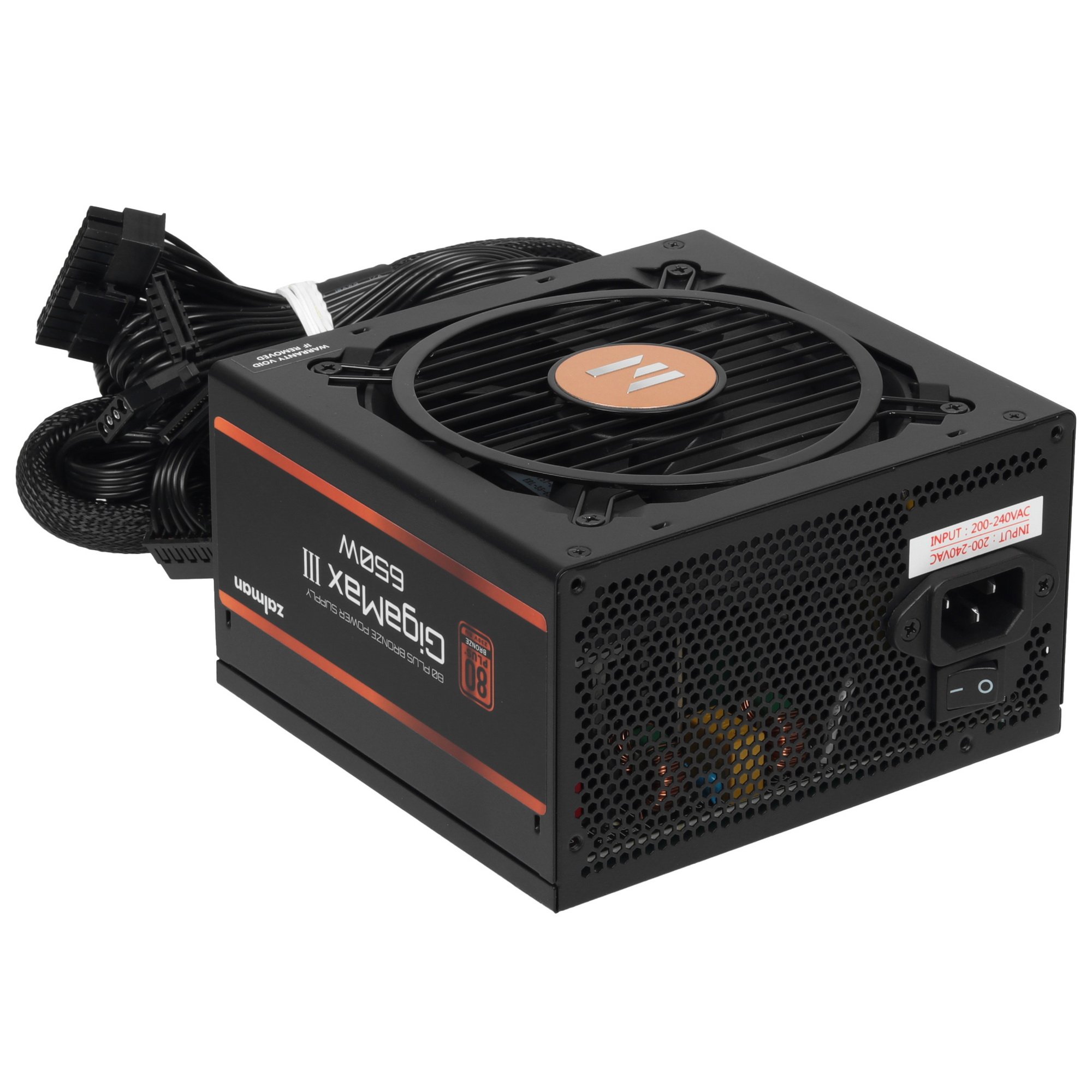 650-ваттный блок питания ZALMAN GigaMax III 650W [ZM650-GV3] в черном корпусе – оснащение для игровых и универсальных системных блоков с высокой производительностью. Модели присвоен сертификат энергоэффективности 80 PLUS Bronze. Она обеспечивает КПД не ниже 88 % при типовых нагрузках.