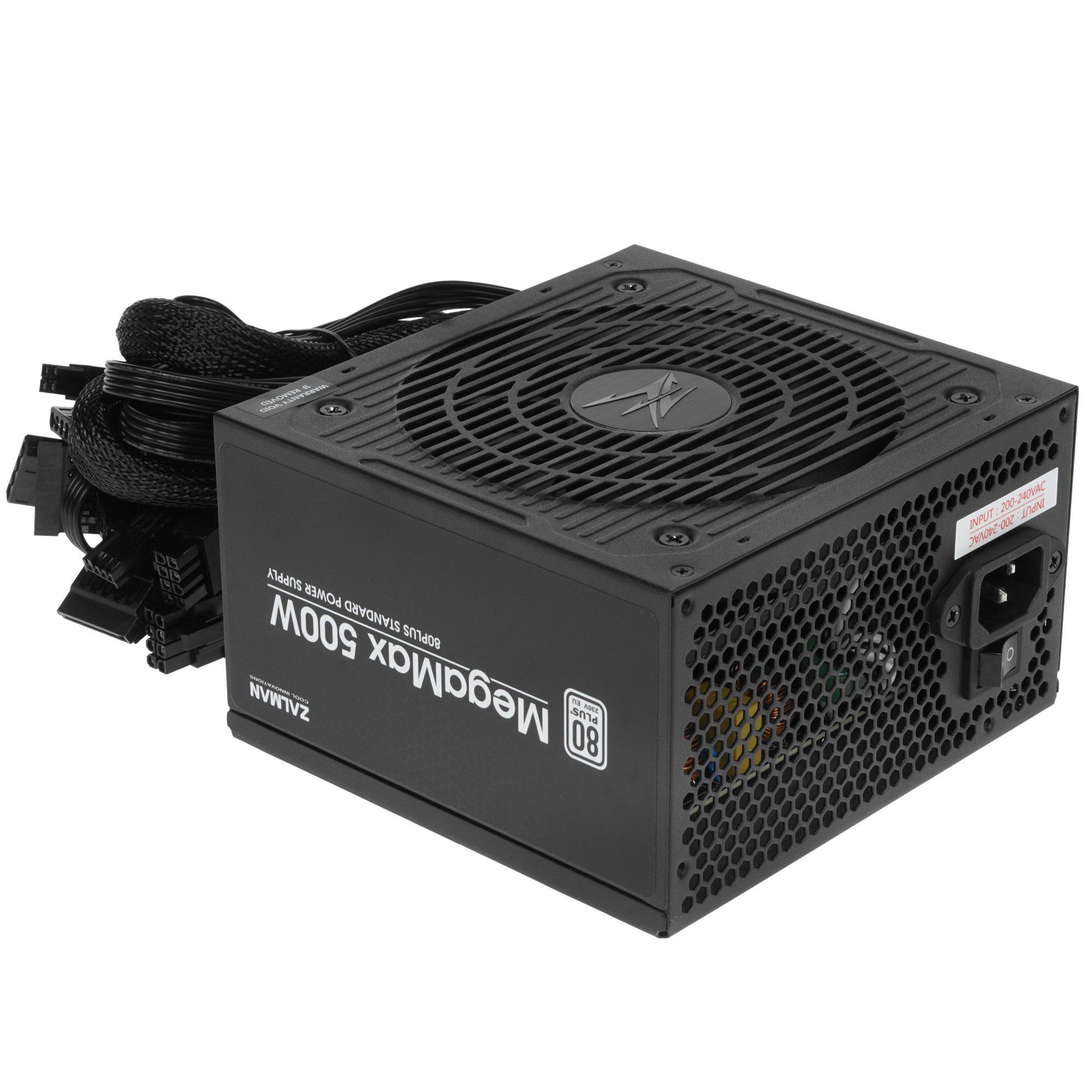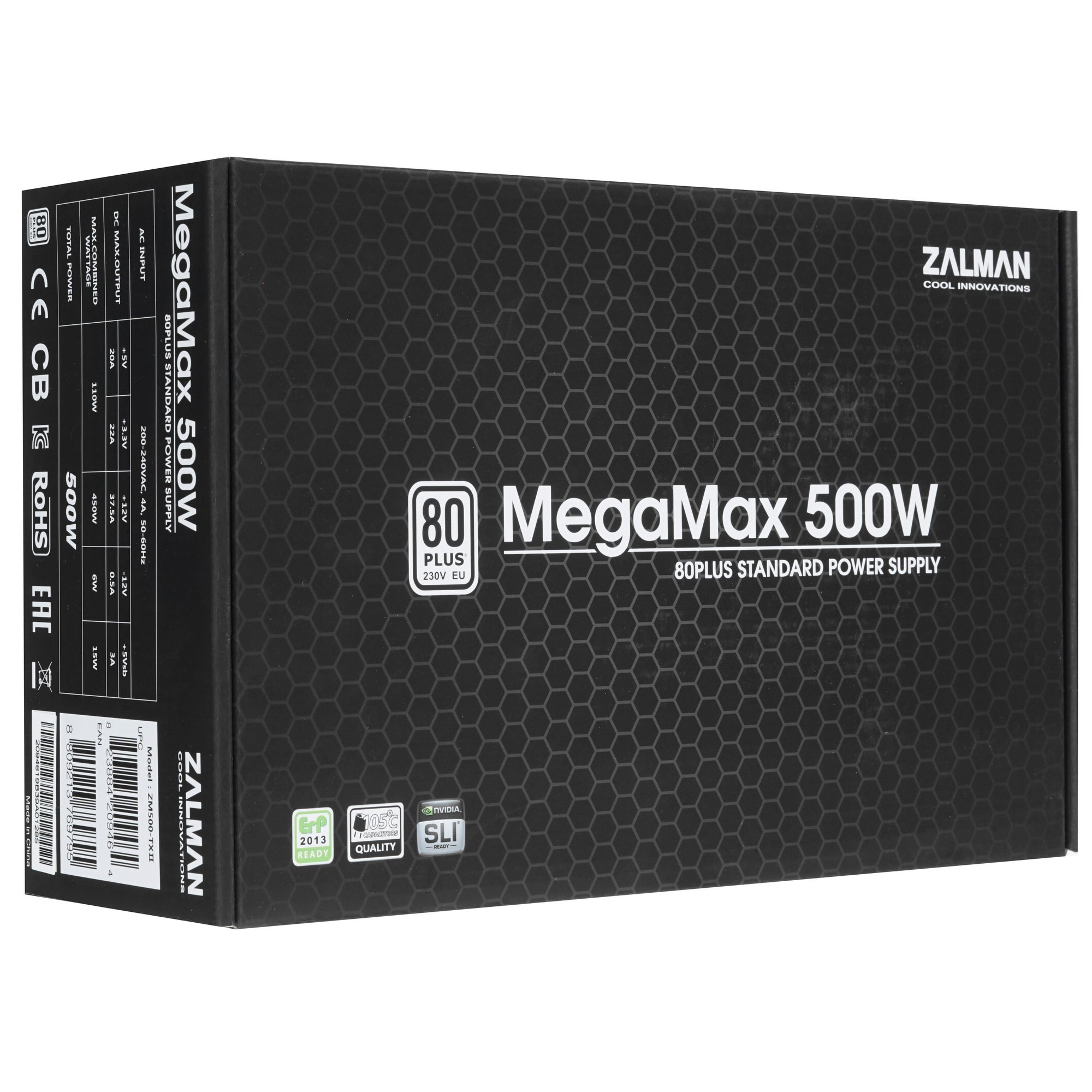 Блок питания ZALMAN MegaMax (TXll) [ZM500-TXII] отличается высокой энергоэффективностью, которая подтверждена сертификатом 80+ Standart. Надежность компонента обеспечена поддержкой технологий защиты OPP, OVP, SCP и UVP. БП демонстрирует общую выходную мощность по всем линиям порядка 500 Вт, чего будет достаточно для снабжения энергией всех модулей-потребителей в системном блоке домашней станции или даже игровой сборки начального уровня. Эта модель уверенно функционирует при входном напряжении на уровне 200-240 В при частоте переменного тока 50/60 Гц.