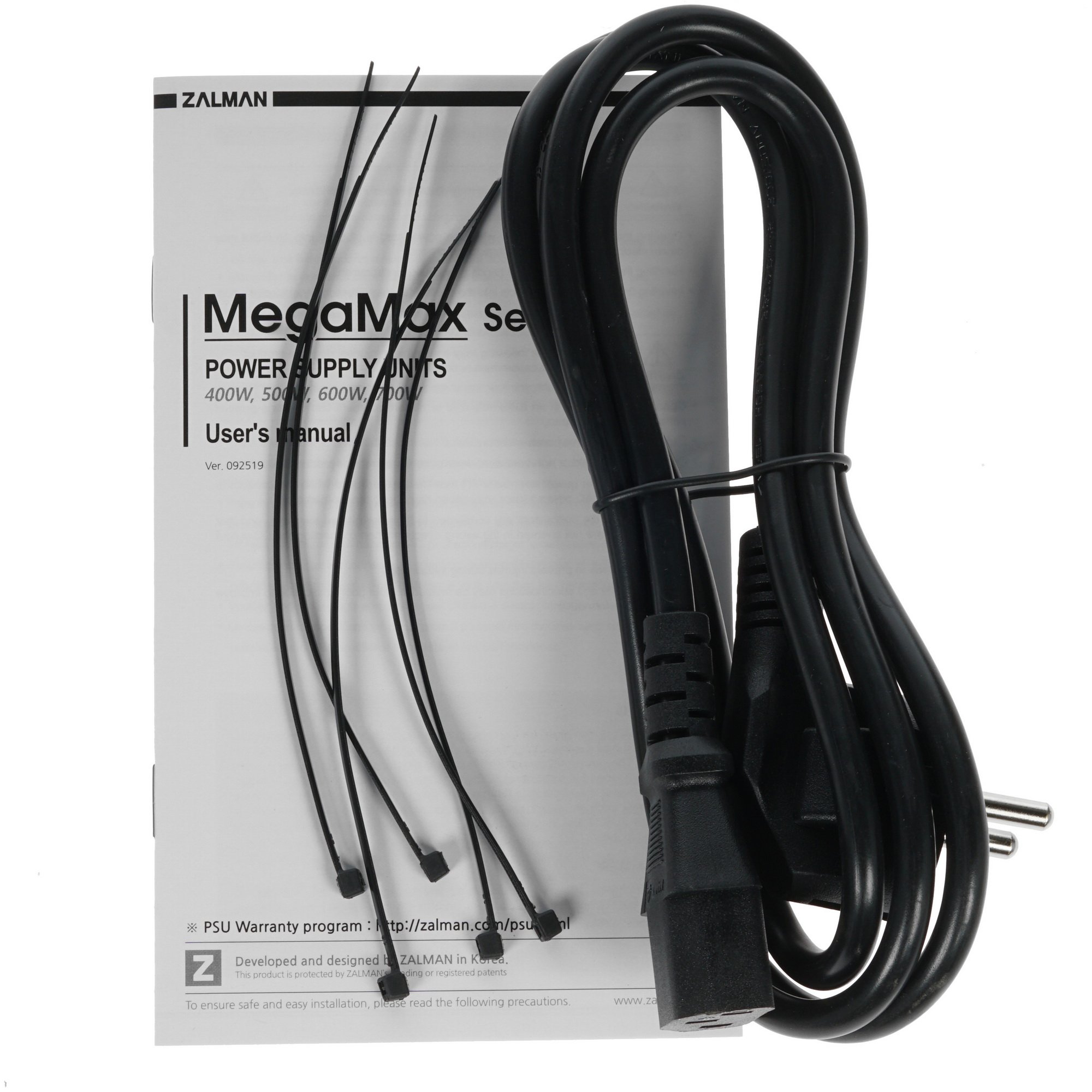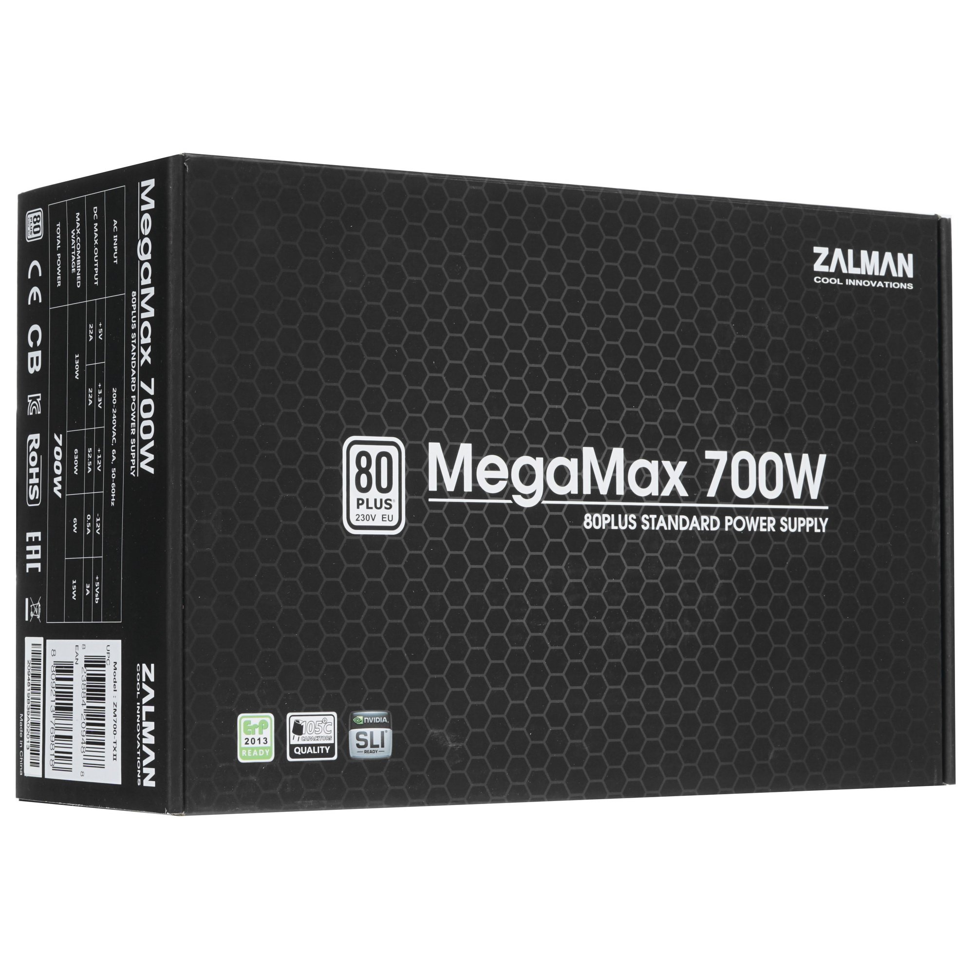 Блок питания ZALMAN MegaMax (TXll) [ZM700-TXII] отличается стабильной работой благодаря поддержке защитных технологий OPP, OVP, SCP и UVP. Компонент с суммарной для всех линий выходной мощностью на уровне 700 Вт комплектуется кабелями с основным разъемом питания 20+4 pin, с интерфейсом 8+4 pin для питания ЦПУ, с разъемами 6x SATA и 4x 6+2 pin PCI-E. Все кабели получают стильную защитную оплетку. Уверенная работа БП, снабжающего энергией все потребители системного блока, гарантирована производителем при напряжении в питающей электросети 200-240 В и частоте переменного тока 50/60 Гц.