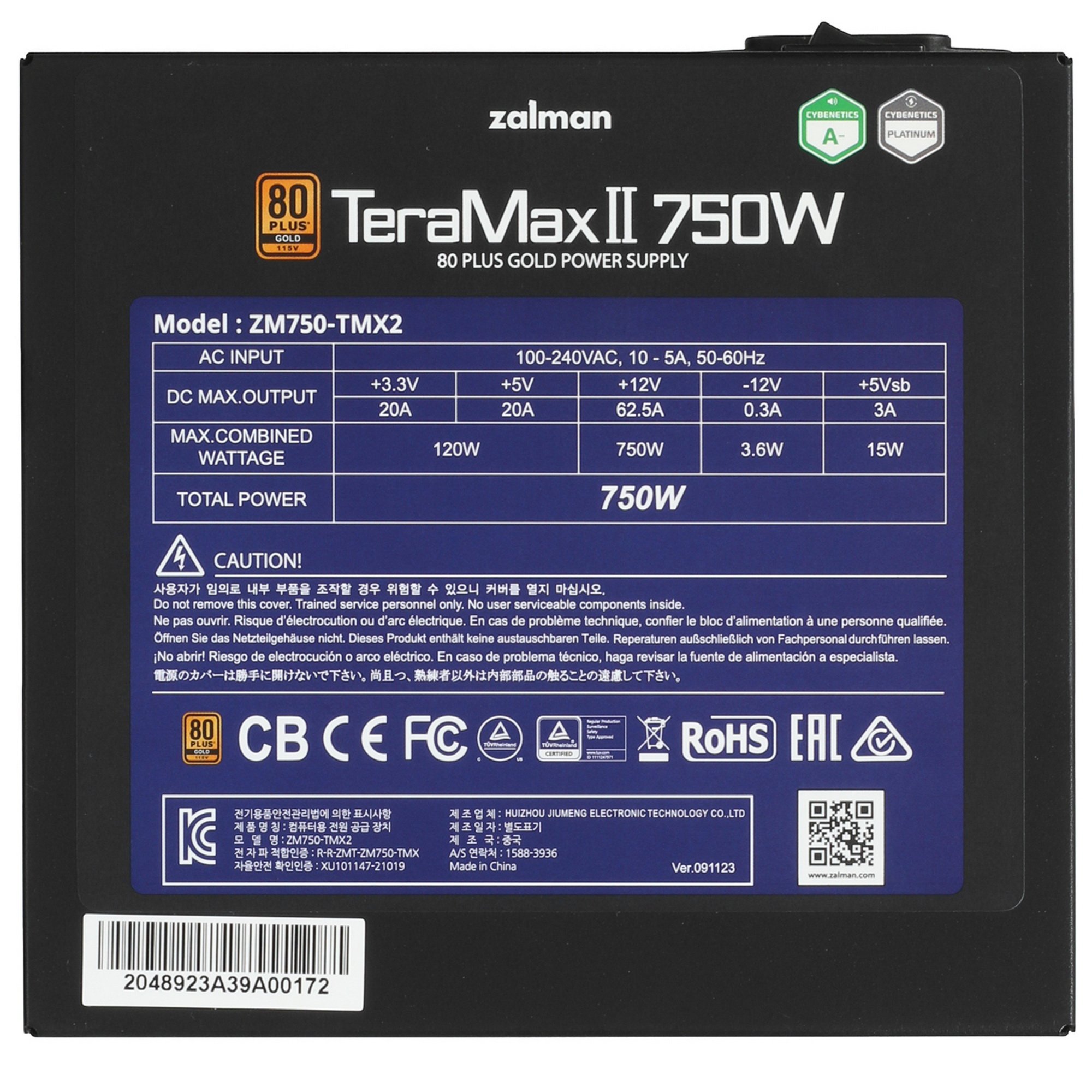 Номинальная мощность БП ZALMAN TeraMax II 750W [ZM750-TMX2] – 750 Вт. Показатель достаточен для питания производительного процессора, игровой видеокарты, многочисленных накопителей и других устройств. Модель рассчитана на комплектацию мощного домашнего или офисного ПК. Устройству присвоен сертификат энергоэффективности 80 PLUS Gold. Блок питания отличается высоким коэффициентом полезного действия. Безопасность эксплуатации устройства гарантируют технологии защиты OCP, OPP, OTP, OVP, SCP и UVP.