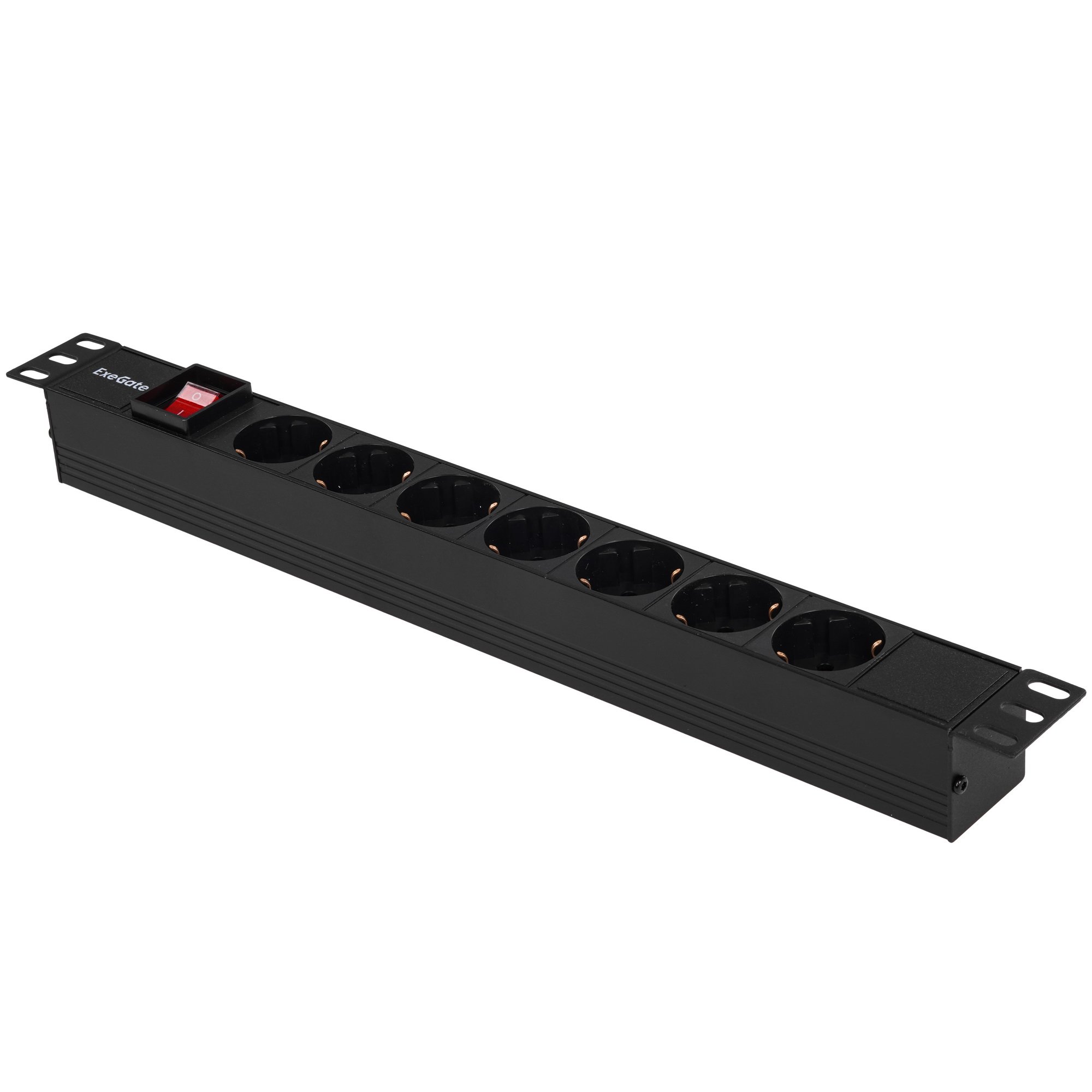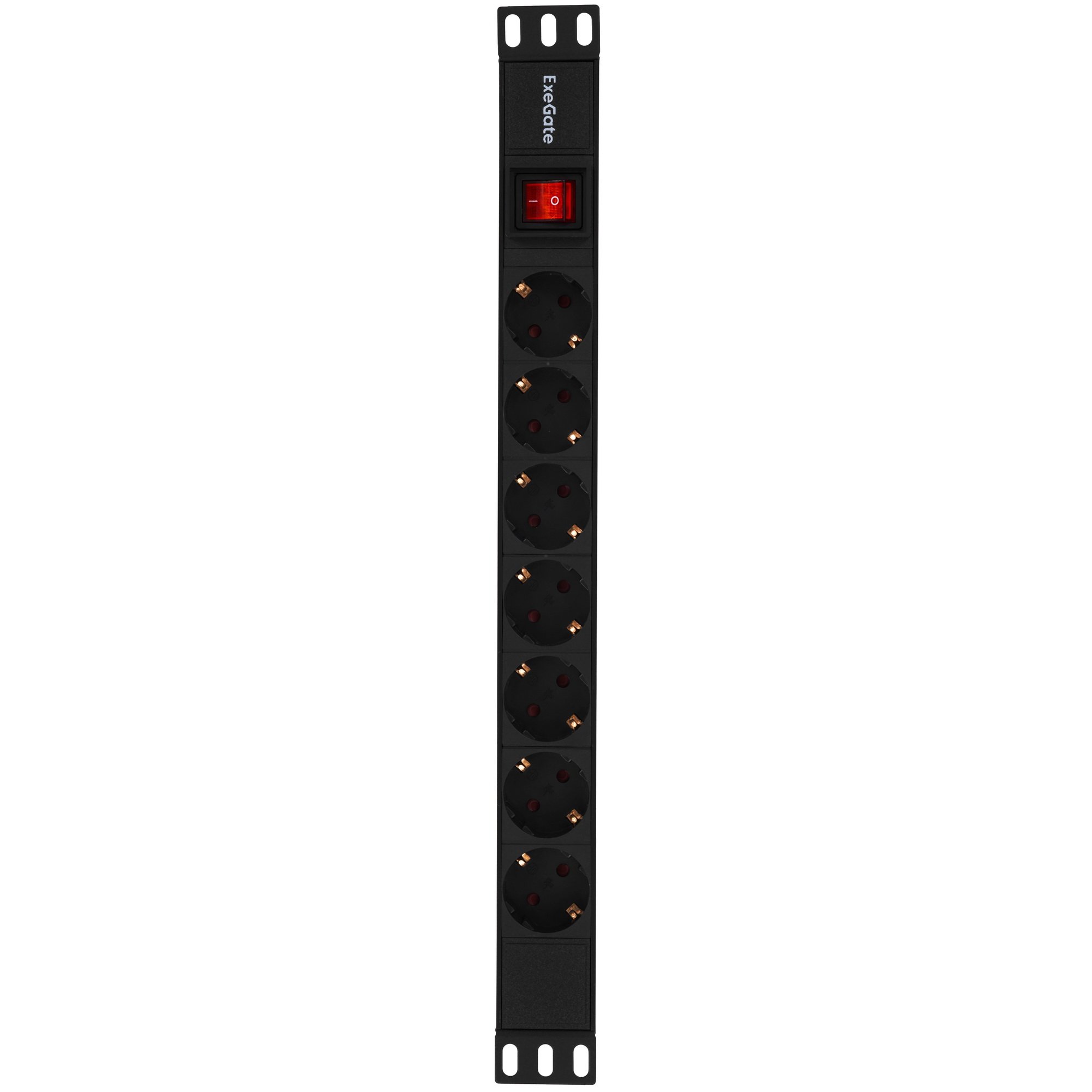 Блок розеток горизонтальный ExeGate ServerPro PDU-19H703 Al-7S-C20-SW, 19", 1U, Алюминий, 7 Schuko, С20, выкл. с подсветкой, черный