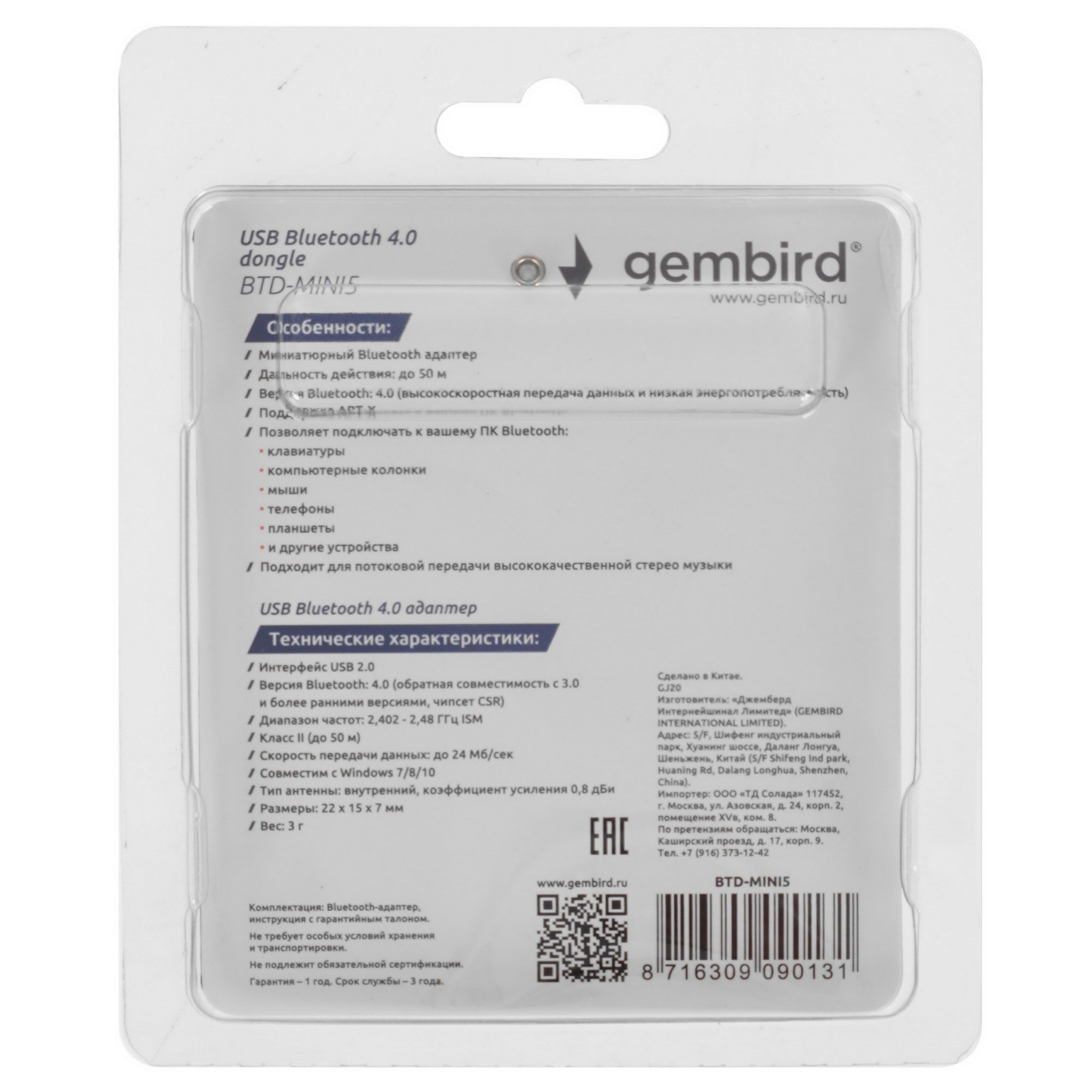 Адаптер Bluetooth Gembird, BTD-MINI5, ультратонкий корпус, v.4.0, 50 метров, до 24 Мбит/сек, USB