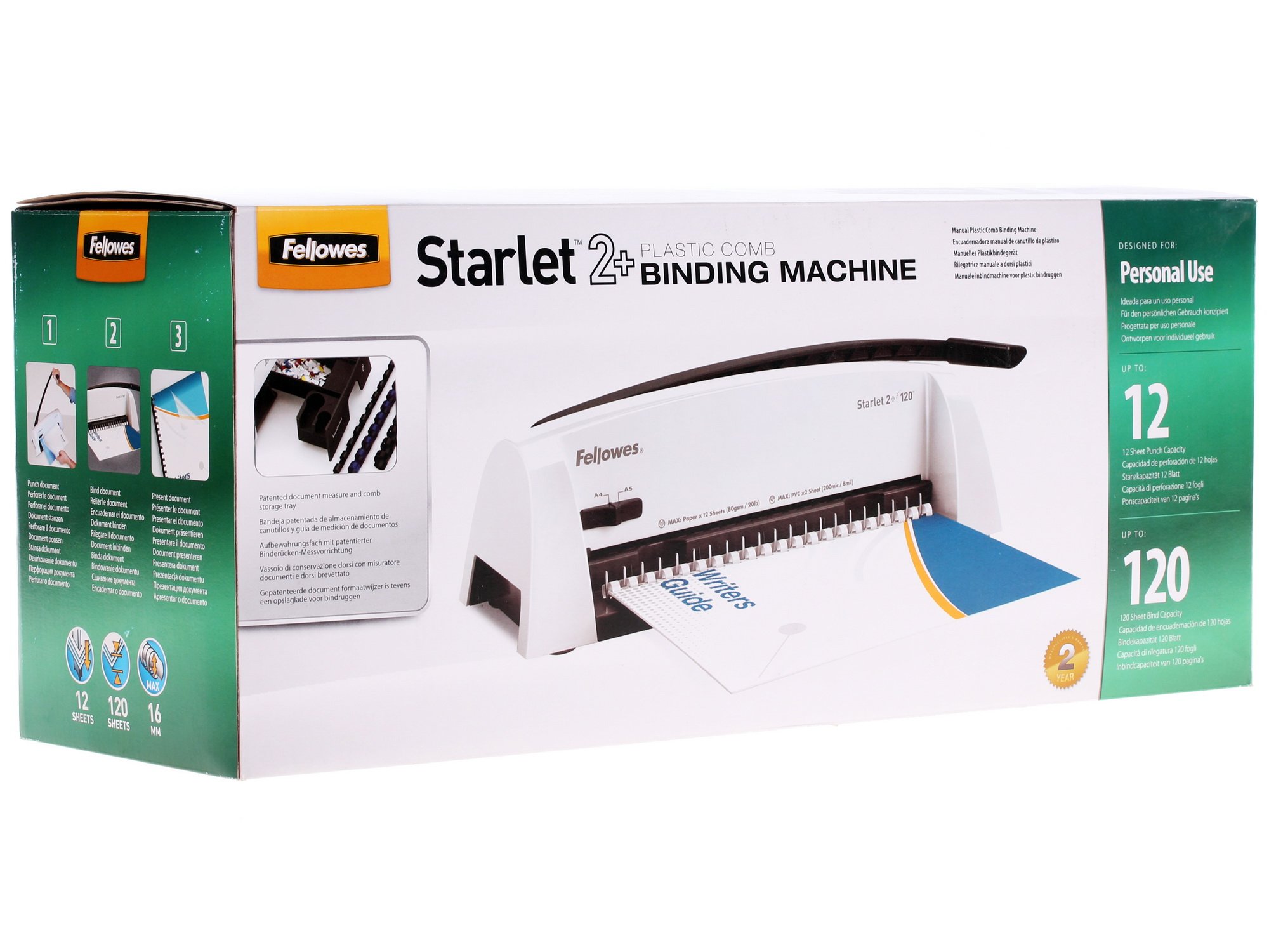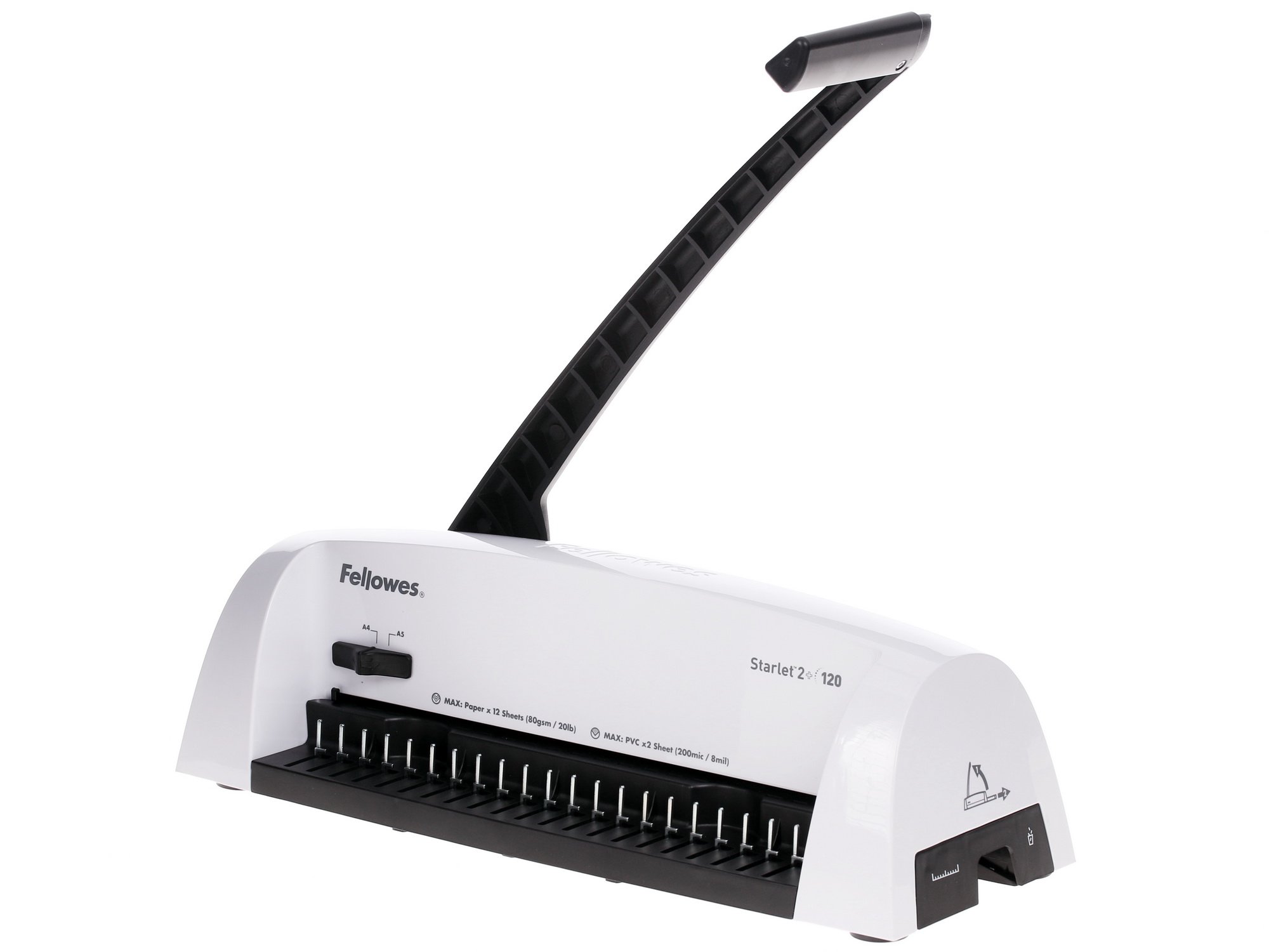 Fellowes Starlet 2+ проделывает прямоугольные отверстия для пружины с максимальным диаметром 16 мм. В конструкции изделия предусмотрен съемный лоток для отходов. Шаг перфорации 9:16.