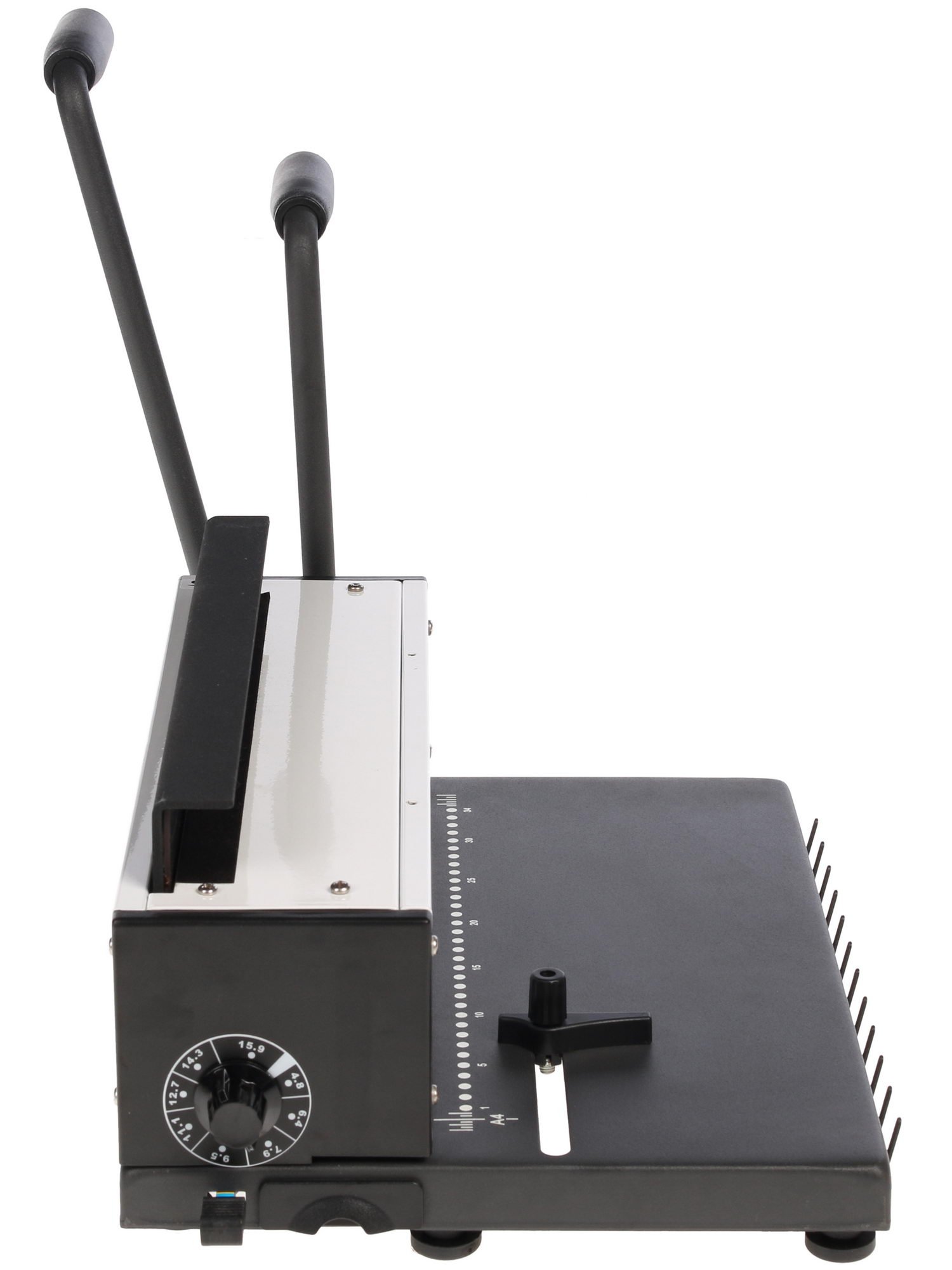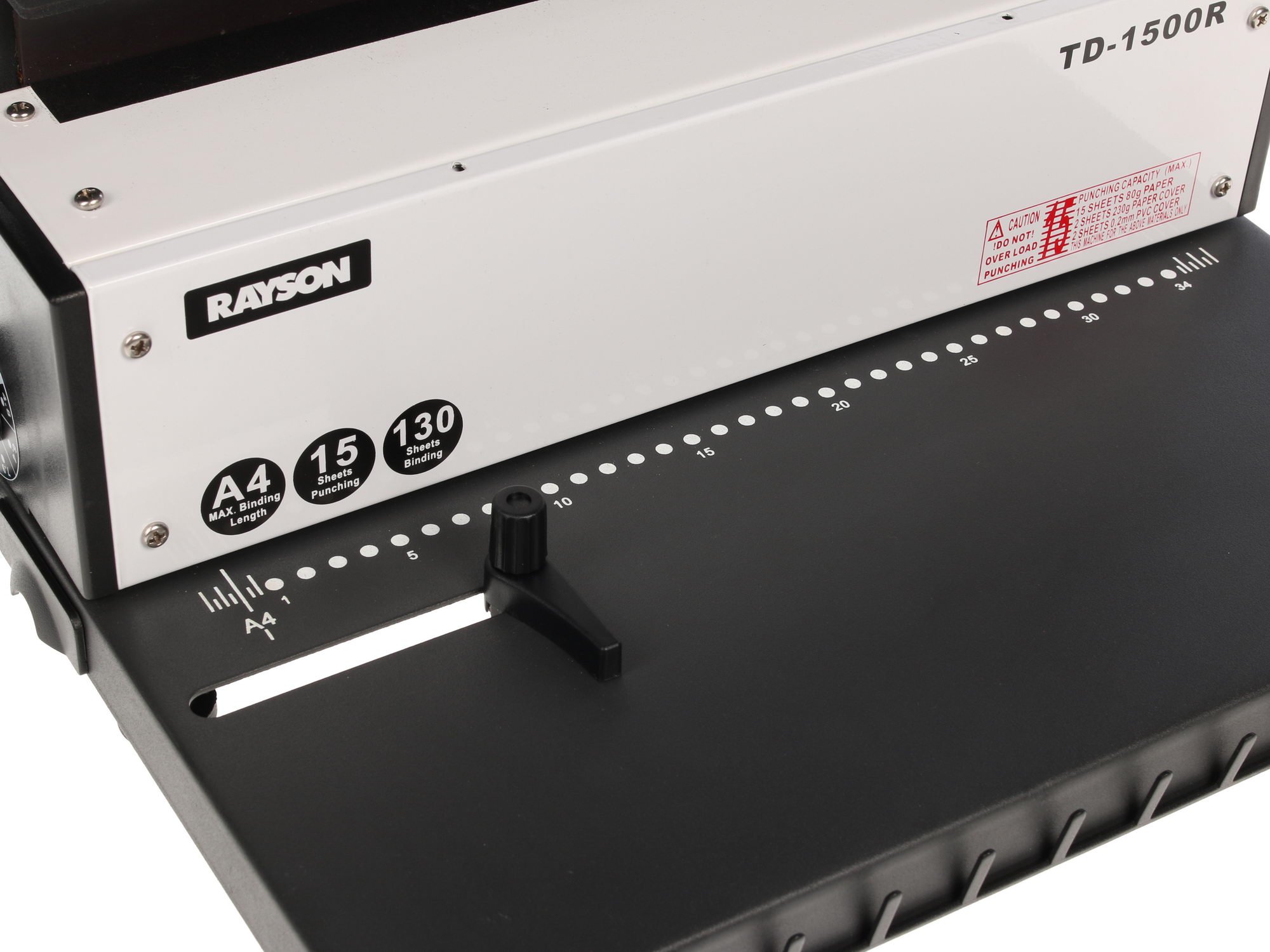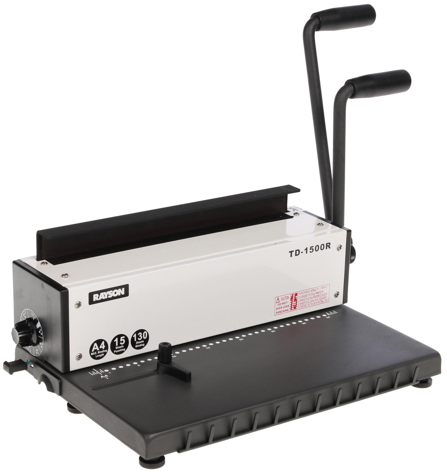 Брошюровщик Rayson TD-1500R готов предложить свои возможности переплета, что идеально подойдет для работы дома или для компаний со средними объемами работы. Модель полностью выполнена из металла, что значительно повышает ее износостойкие качества. Непосредственно сам переплет происходит на металлическую пружину, что также имеет ряд преимуществ перед другими типами материалов. Серия оснащена отдельной рукоятью для перфорации и для брошюровки. Максимальная толщина переплёта – 120 листов, перфорации – 15 листов. Rayson TD-1500R позволяет пробивать круглые отверстия, что является универсальным вариантом. Для удобства и использования и более точной настройки представленный брошюровщик оснащен фиксатором для выравнивания страниц документа, возможностью выбора одного из трёх режимов контроля отступа от края листа до центра пробиваемых отверстий, а также имеется возможность регулировки уровня диаметра зажима пружины.